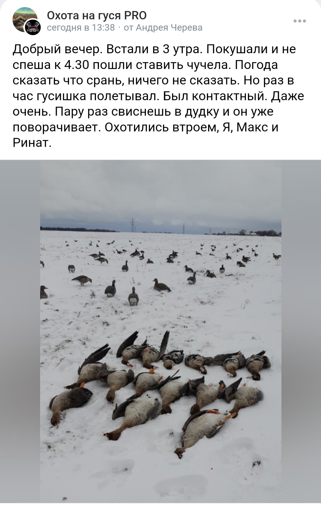 Я в этом сезоне брал путёвки в южные районы на гуся и селезня, но ни одного не взял. Правда ездил только на вальдшнепа.Утром на троих было добыто 15 гусей.