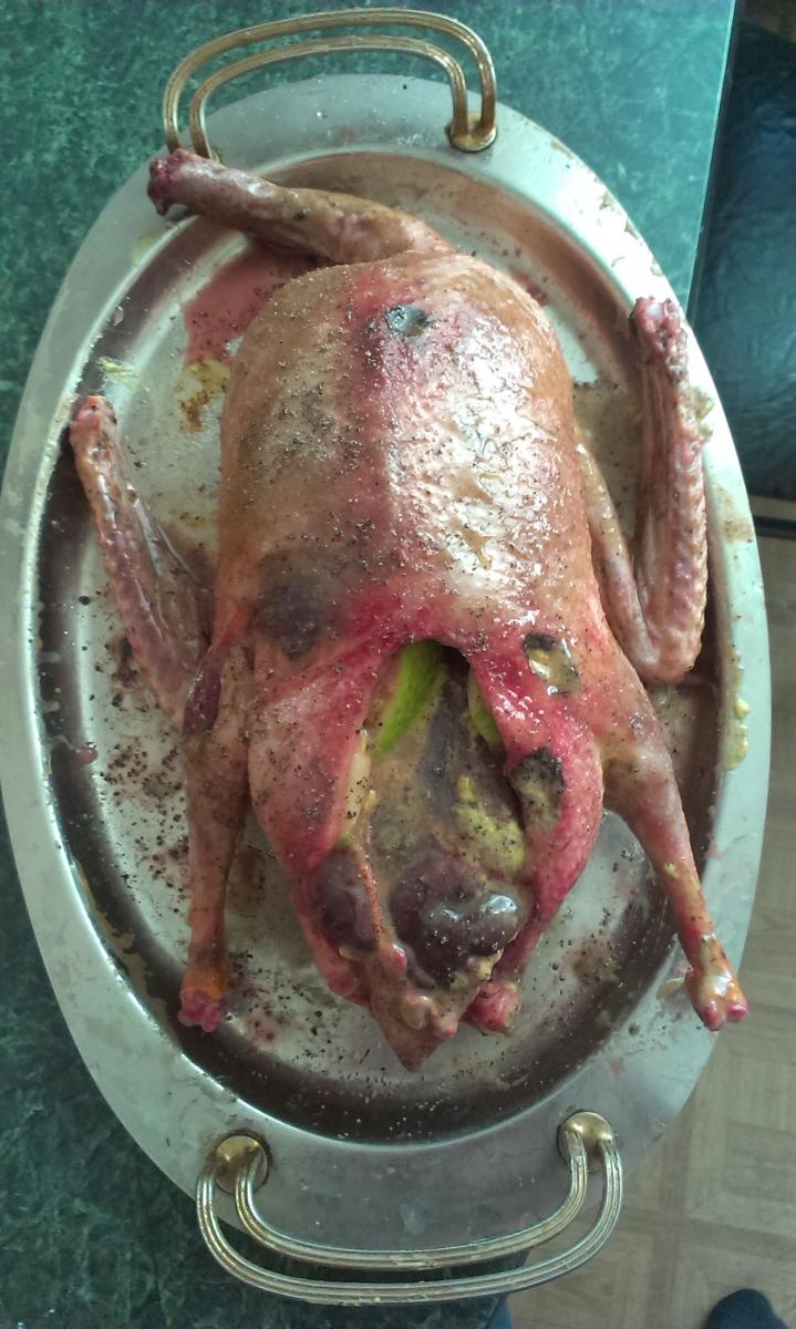 Естественно натёр солью и перцем,в чирка положил чернослив и он (чирок) удачно поместился в гусе.Внутрь между чирком и гусиком положил дольки несладких яблок.Снаружи гуся обмазал "незлой" горчицей и медом (так моя мама делает).Гуся в рукав,туда же остатки яблока.Через 1,5 часа при температуре 200С ткнув гуся под ребро
