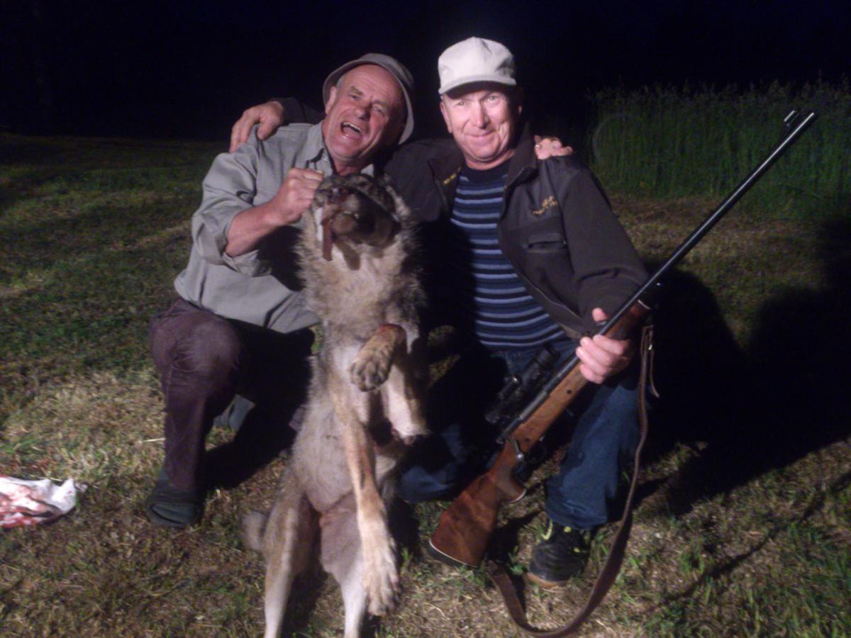 "Уже хотели слезать с лабаза как слышим по ручью, хлюп-хлюп-хлюп, ага идут. И тут из канавы прямо на поле вылезает волк. Первым выстрелом перебили передние лапы. Закрутился, втором разворотили грудину, волк лег сразу!"