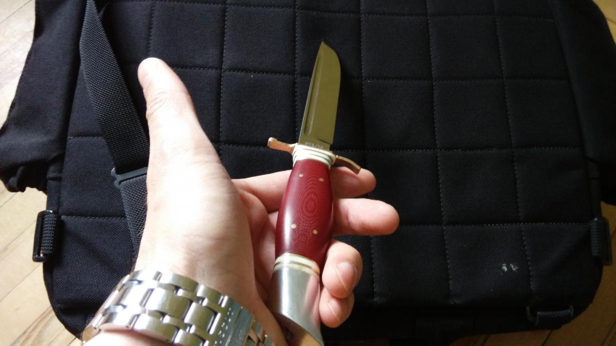 Огражданил, охозбытил. Снял гарду, сделал больстер. Теперь можно полноценно пользоваться ножом и не думать о "двушечке". В принципе, без гарды живьём тоже неплохо выглядит.
