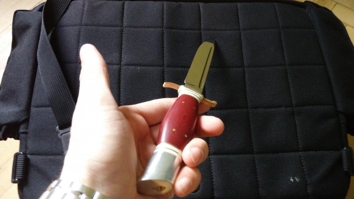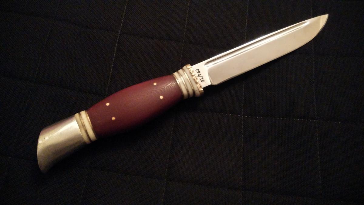 Ещё один. Клинок, заготовку гарды, заготовку тыльника покупал на ганзе. Х12МФ, G-10, латунь, алюминий, кость верблюда. Рукоять разборная, снимается сама рукоять и гарда.
