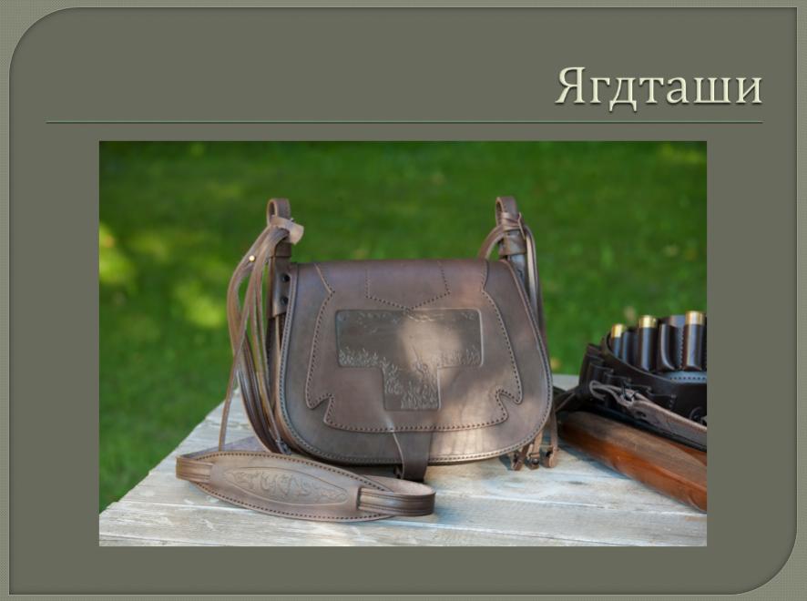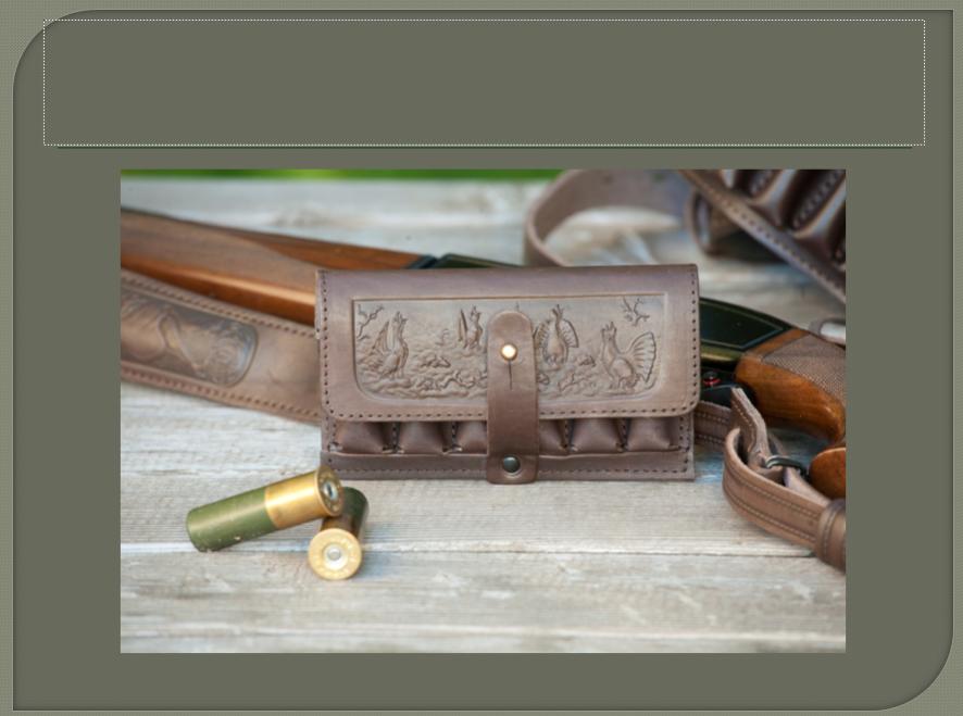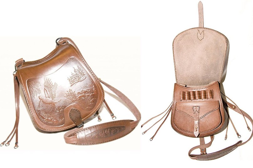 8. Ягдташ изготовлен из высококачественной кожи и украшен художественным тиснением,оснащен подвесами для дичи. Под крышкой место для 6 патронов 12/16 калибра. малый 5300 руб., средний 6900 руб., большой 7500 руб.