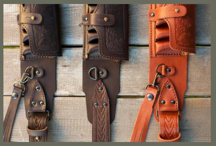 Из натуральной шорно-седельной кожи чепрак с естественным лицевым слоем (не спилок), возможны различные цвета: коньяк, темный шоколад. Изделия изготовлены вручную в Санкт-Петербурге. Украшены художественным термотиснением. Машинная прошивка капроновой нитью. Заклепки в местах максимальной нагрузки. Кожа обработана дополнительно прозрачным воском. Можно изготовить эксклюзивно под себя любое изделия из кожи, от колчана для стрел до любого патронташа, сумки, рюкзака или чехла. Цвета на выбор.