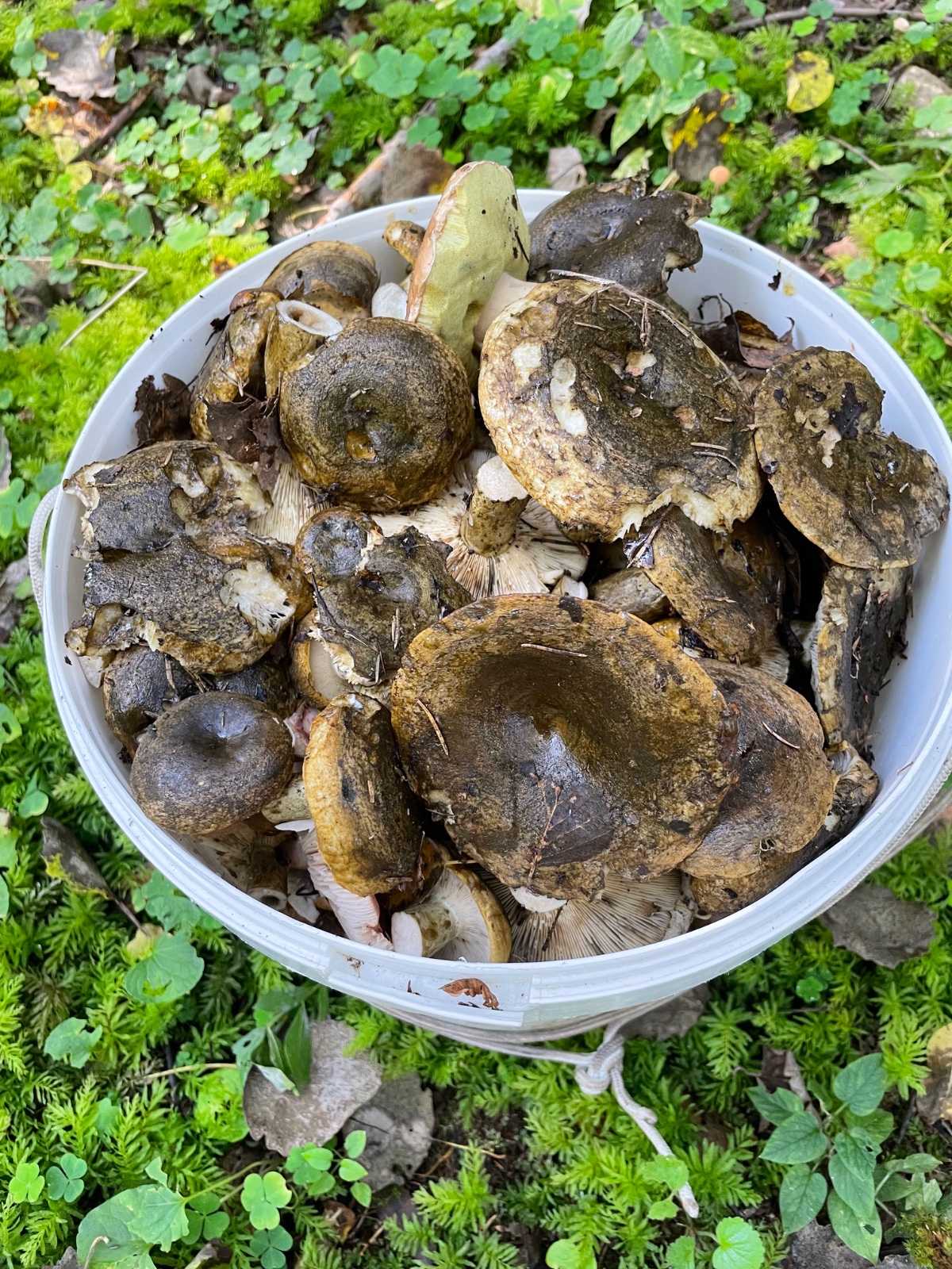 Все благородные либо в плесень ушли, либо переростки. Опят на березах море, но почти все переростки. Новых очень мало. Набрали 4 корзины. Немного волнушек.