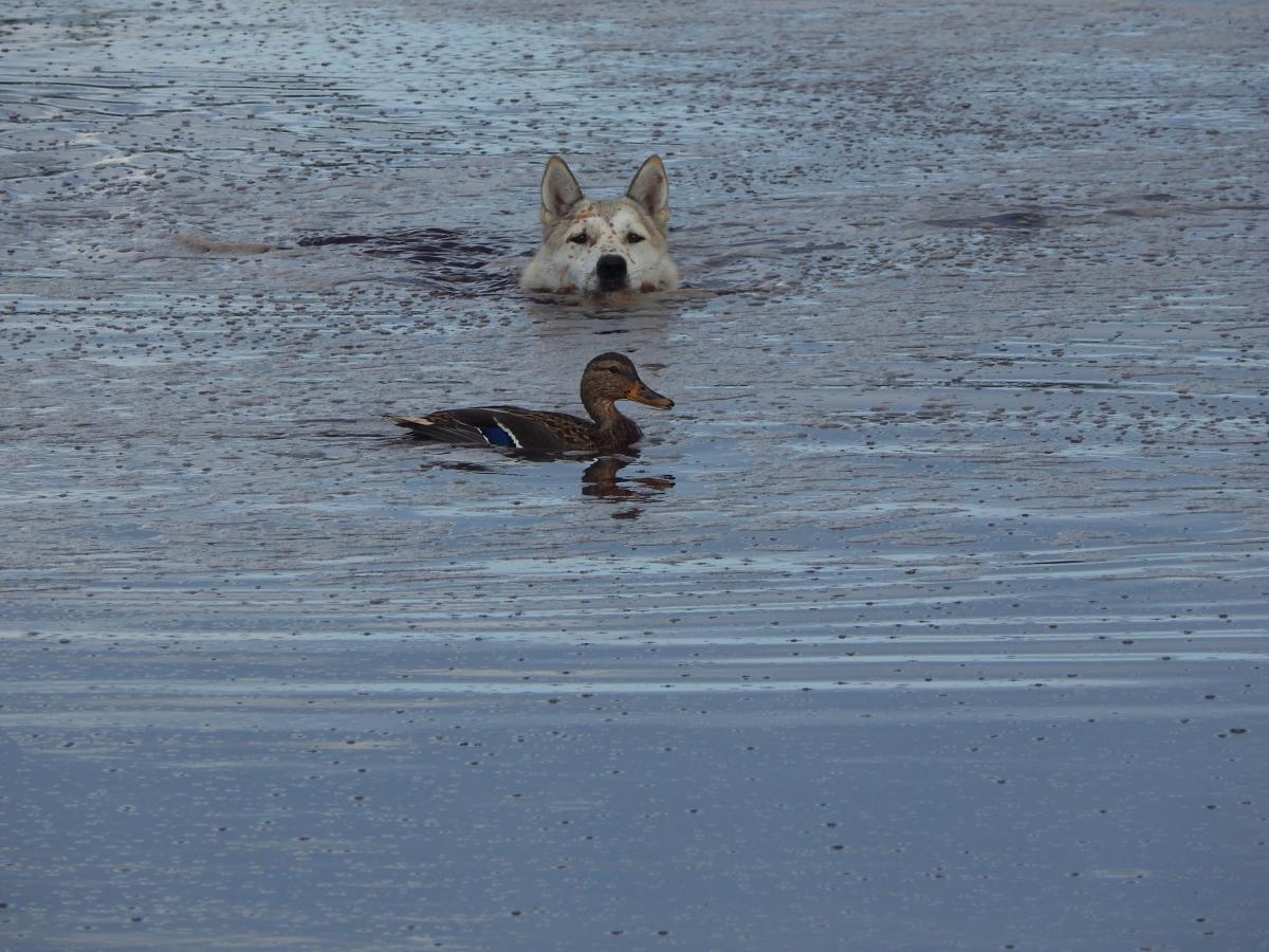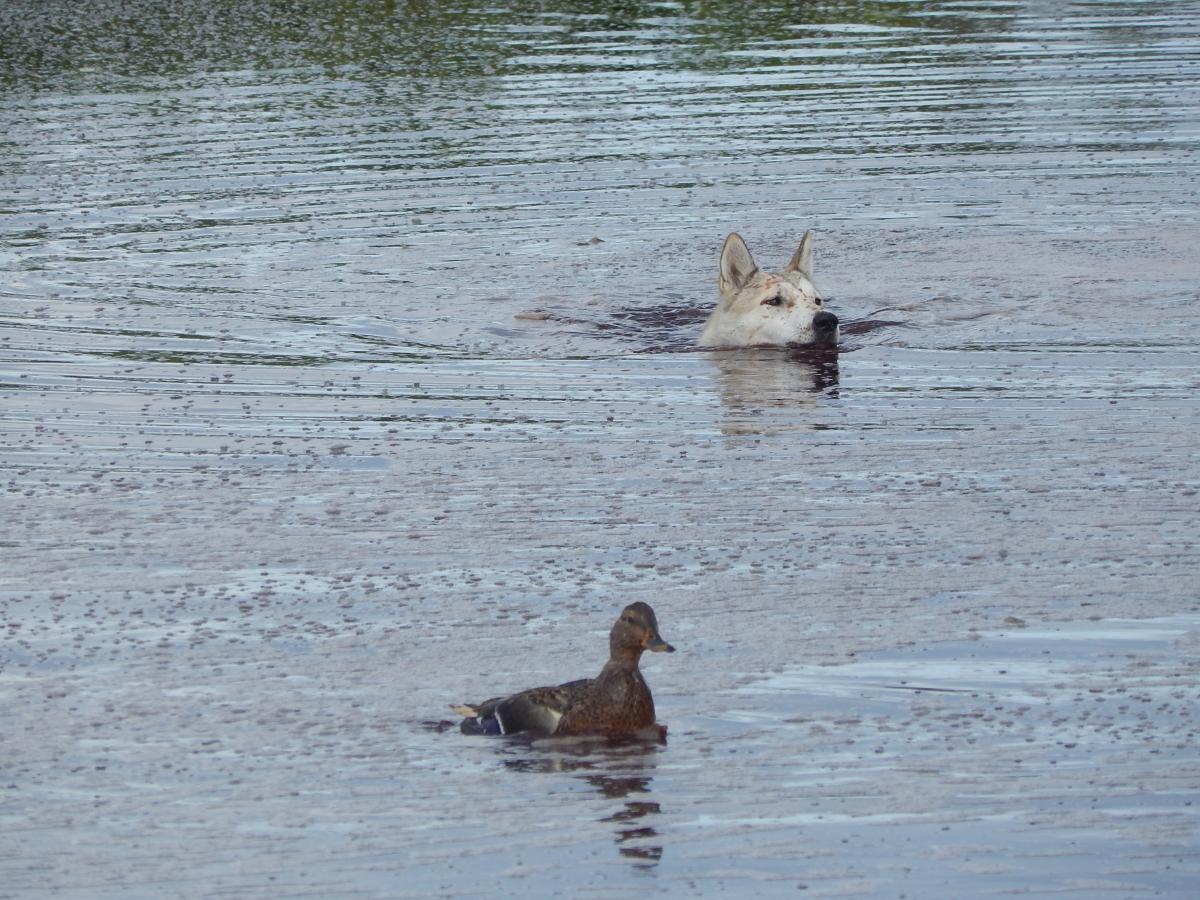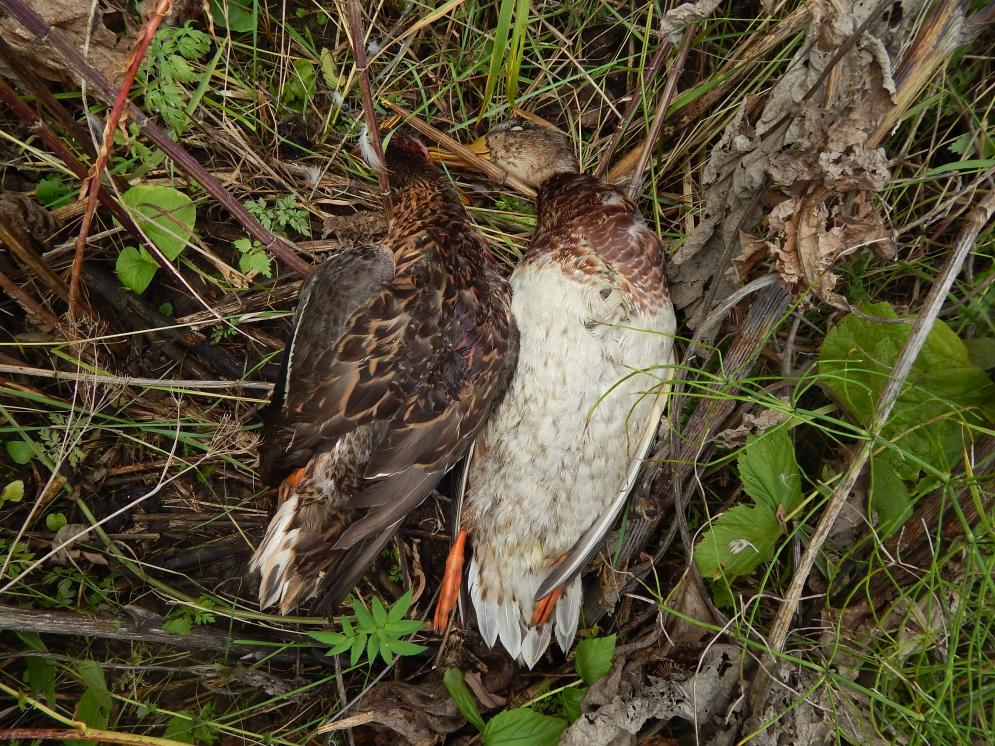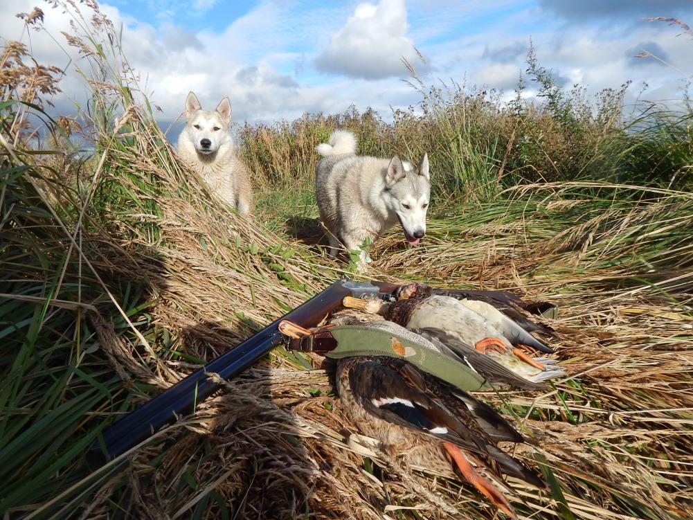 />/>/> решил их проведать. Два места бывшие в заначке , и я нутром чуял, что по дуплету на них сделаю, даже знал откуда они вылетят , просчитал как отпущу Яну с Вестой. Первое болотце-тихии уголок , поросшии ряской и окруженный репейником , вейником , чернобыльником и осокой. Взлет из-под берега-размеренный дуплет и начавшии линять крякаш камнем , а утка планирует в траву высотой в рост . Яна сходу прыгает в воду и уже стоит у селезня, Веста засекшая вторую-душит подранка, слышу как возится, без собак тут ни в жизнь не найти .