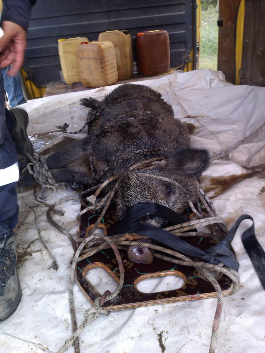 В ходе операции по спасению кабана его пришлось связать. Поднять животное на носилках смогли лишь трое мужчин. Кабана напоили водой, промыли поцарапанный клык. Других повреждений не было.