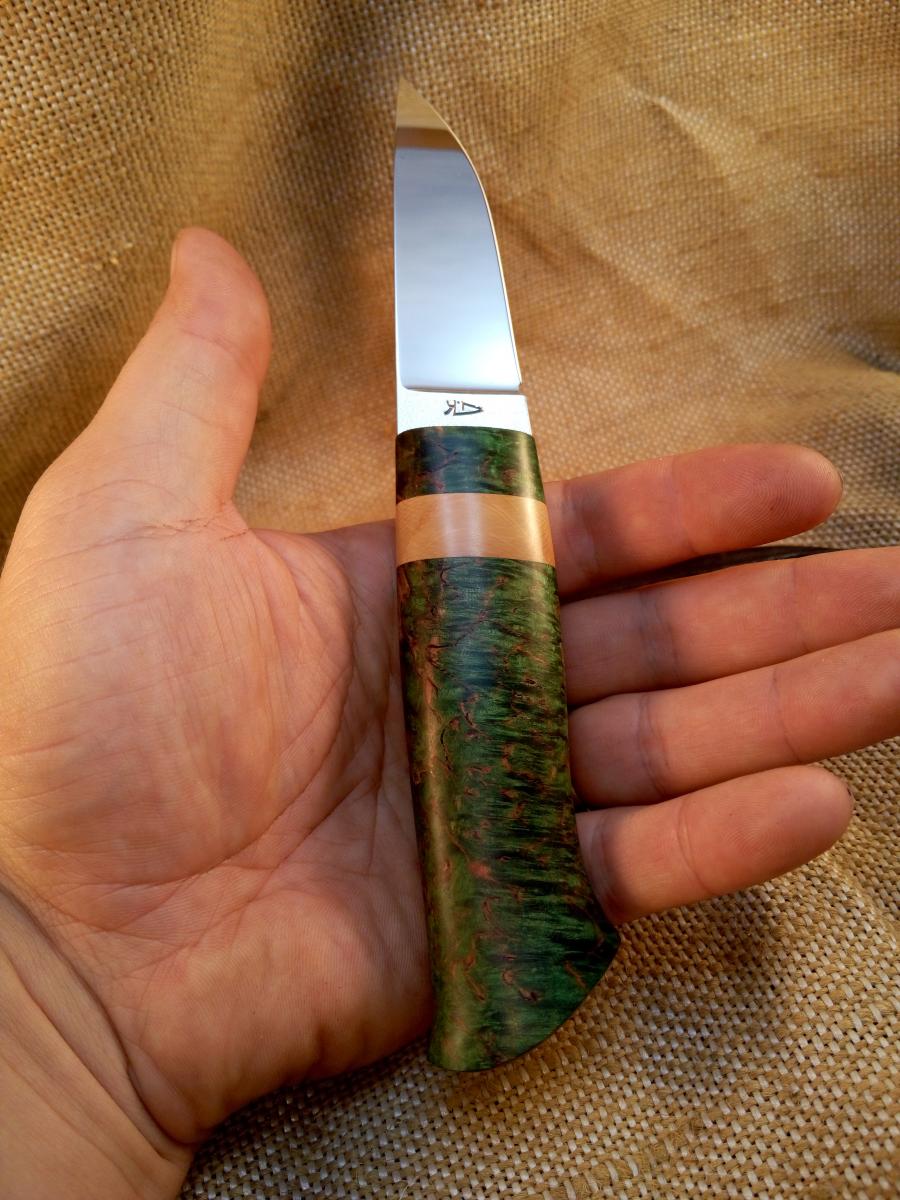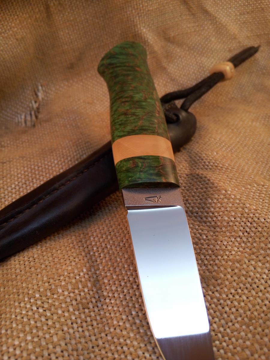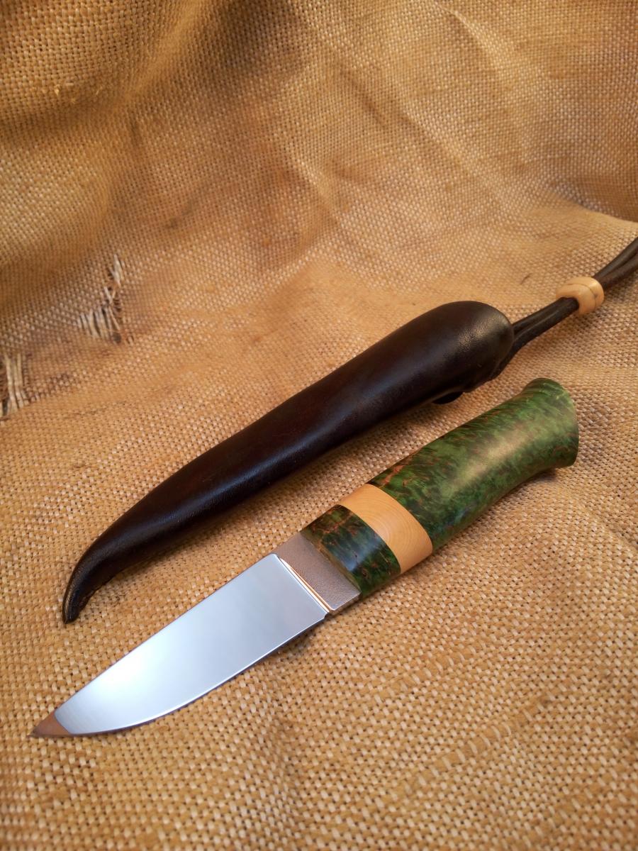 Здравствуйте! Продам не большой нож скандинавского типа.Клинок Tony Karlsson(швеция)нержавейка AEB-L 88x26x3.5мм. Рукоять 110х30х19мм стабилизированная карельская берёза,бивень мамонта,покрыта тиковым маслом.Ножны кожа,на подвесе мамонт. Цена 6000 рублей.тел.8911 285 02 99