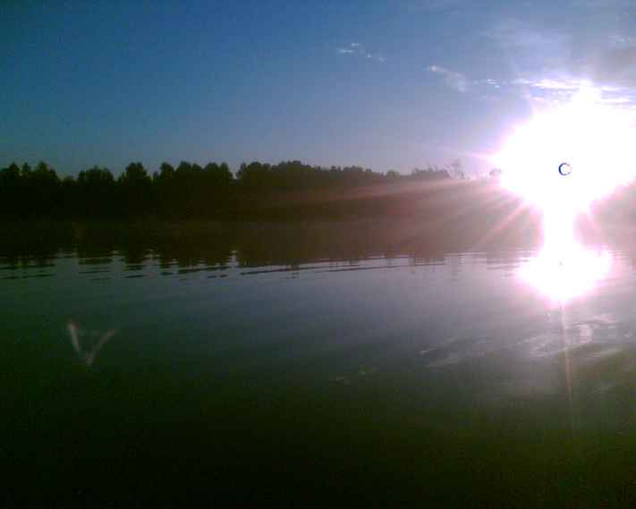 . Принимае решение продолжить поиски днем, прыгаем в лодку, идем на "дальний карьер" , где всегда поднимали утей. Над лесом взошло солнце - крАсота........