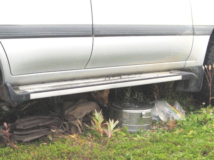 После отдыха напарник опять пошел на вечернюю зорьку на озеро проверить отремонтированное ружье и догнаться по уткам. Я же походил по окрестностям, посвистел кулика. Не удачно. Зато подходя к лагерю увидел мелькнувшую рыжую шкурку около шатра. Вытащил фотоаппарат и подкрался в лагерь. Выглядываю из-за шатра- вот она-рыжая бестия….