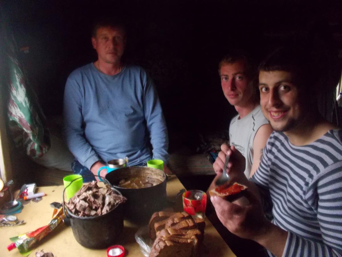 Дождей было не много. Раз всего и спасались в зимухе,за два дня вещи все промокли. Рыбы ведер семь засолили .Питались в основном добытым . Славо Богу руки ещё помнят ,с какой стороны за ружо браться. Сплав затянулся и с хлебом,табаком и сладким была нехватка.