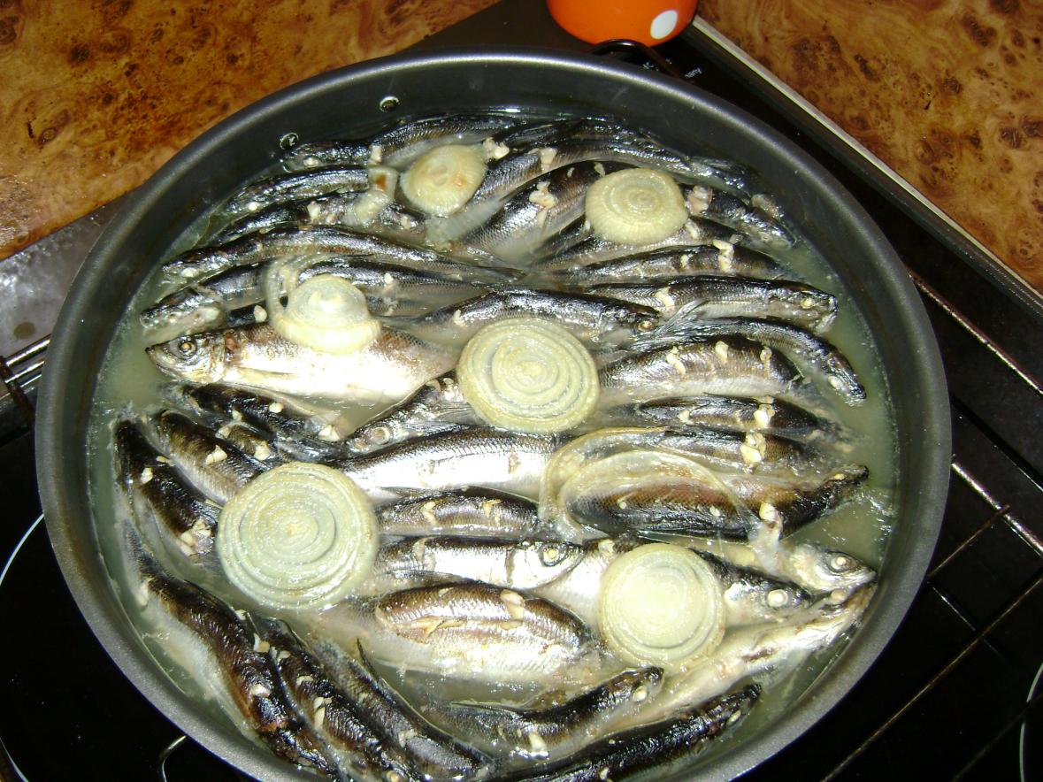 В дуршлаге (желательно с плоским дном) опускаем ряпушку(без голов и потрошёную) . Вода закипела, 5-8 мин. (от размеров рыбы) и снимаем. Мясо должно легко отделяться от хребта вилкой.