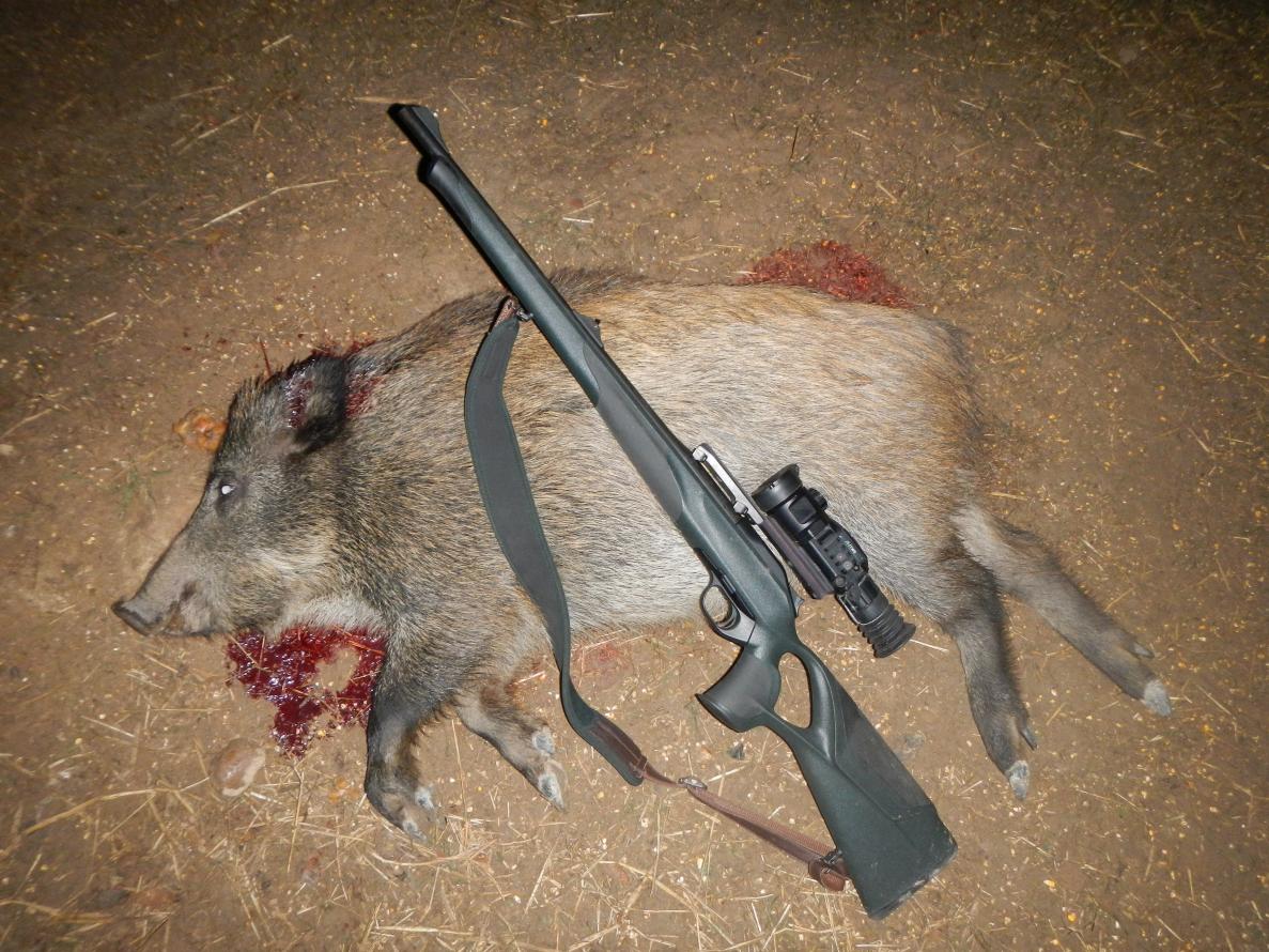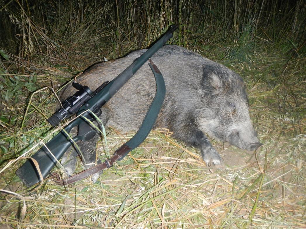 Перешёл ручей и, понимая, что сильно припозднился, не торопясь, без лишнего шума двинулся в сторону поля. Ветерок был удачный и я стал заходить с холма! Вся дорога была усыпана покрывалом из осыпающихся осенних листьев! И шорох листьев под нагами был единственным шумом в лесу, хотя я и старался ступать мягко! Подойдя к началу спуска с холма на поле, я осмотрел кусочек поля, видимый в проёме спускающейся к полю дорожки. Никого! Стал тихо спускаться. На середине склона, сместился по дорожке на правую обочину, чтоб с дорожки увидеть ту часть поля, за которой расположилась кормушка! Поднимаю карабин, включаю прицел и вижу кабана! Одного! Думаю - секач! Больших секачей не стреляем, поэтому решаю не торопиться и оценить его размеры! Присев на одно колено на мягкое покрывало из листьев, прижимаюсь к дереву для удобства и начинаю за ним наблюдать! Спустя несколько минут в овсе замечаю ещё одного! И в течении 10 минут появляются ещё несколько! Понимаю, что на поле кормится стадо! На кормушке остаются есть два крупных и какое то кол-во разбрелось по полю! Видимость ограничена зоной проёма дорожки! Кол-во посчитать не могу, но вижу и крупных и поросят! Для лучшей видимости переползаю на левую обочину дорожки, но пока переползал они снова переместились! Решаю ждать, пока не появится шанс на выстрел! Спустя 15-20 минут они сместились ко мне на дистанцию 30-35 метров! Улучив момент ложу поросёнка! Всё это действо писал на рекодер, но он оказался разряжен и видео не пошло! Фото прилагаю!