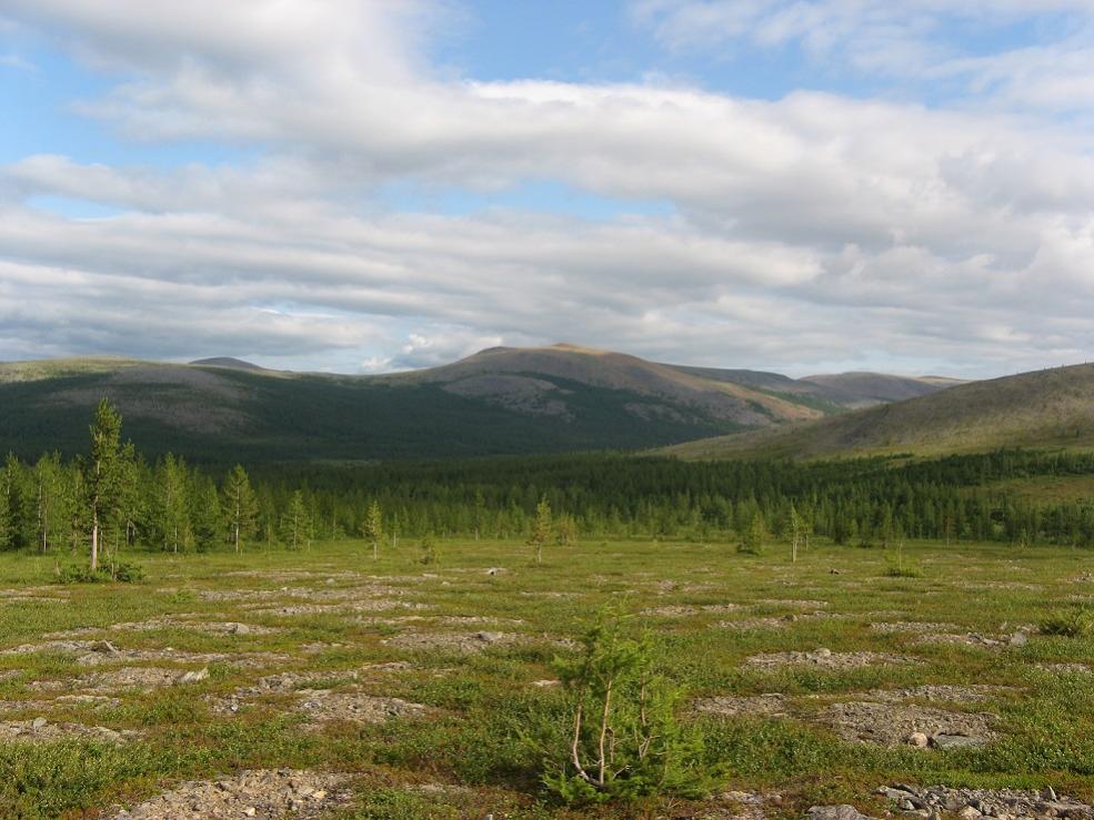 Ну чтож, пришло утро. Солнце светит. Рядом уже безлесные невысокие горы. Нам еще километров 6 пути до озера Колокольня. Собираемся идем. Поднимаемся на уже безлесную часть гор через 2-3 часа пути и… И ту началось! Куда умчалось лето? Налетели облака, начался ВЕТЕР. Стало холодно. Дождь идет непрырывно. Если он не идет, то с лохматых почти касающихся нас косматых облаков на нас сдувает сырость. ОЧЕНЬ ХОЛОДНО! Температура падает сначала до 8, потом до тех градусов выше ноля. От ветра спасения нет нигде, он дует словно со всех сторон . В какой-то момент мы зашли в какой-то закуток между склонов, где почему-то ветра не было, там не показалось что стало тепле градусов на 10-15, не лгу. Вся одежда сырая насквозь. Греемся только на ходу под тяжелым рюкзаком, движение без рюкзака не греет. Продумает всю одежду. Мембрана, флис, да какая это ерунда! Переодетый пиндос скулит что весь промок. Может теплее было бы в звериной шкуре, какой бы тяжелой и мокрой она не была. Вес одежды и рюкзака уже не имеет значения. Холод страшнее и тяжелее тяжести. Все эти современные вещи работают и сохнут когда дождь перестал. Но надо идти впередк закладке, там катамаран на котором мы надеемся уплыть к цивилизации, а это путь через горы. Вчера, еще вчера было лето! А сегодня оно прошло в никуда! Для сравнения в -30 в лесу я чувствую себя прекрасно , ночую без проблем даже в одиночку. Были бы валенки, котелок, пила, еда, да спички. В -30 теплее. Здесь деться некуда, и леса с дровами нет. Все быстро изменилось. А вот идем мы медленно, наверно менее 1 км в час. Где-то впереди в холодном тумане озеро Колокольня и перевал.