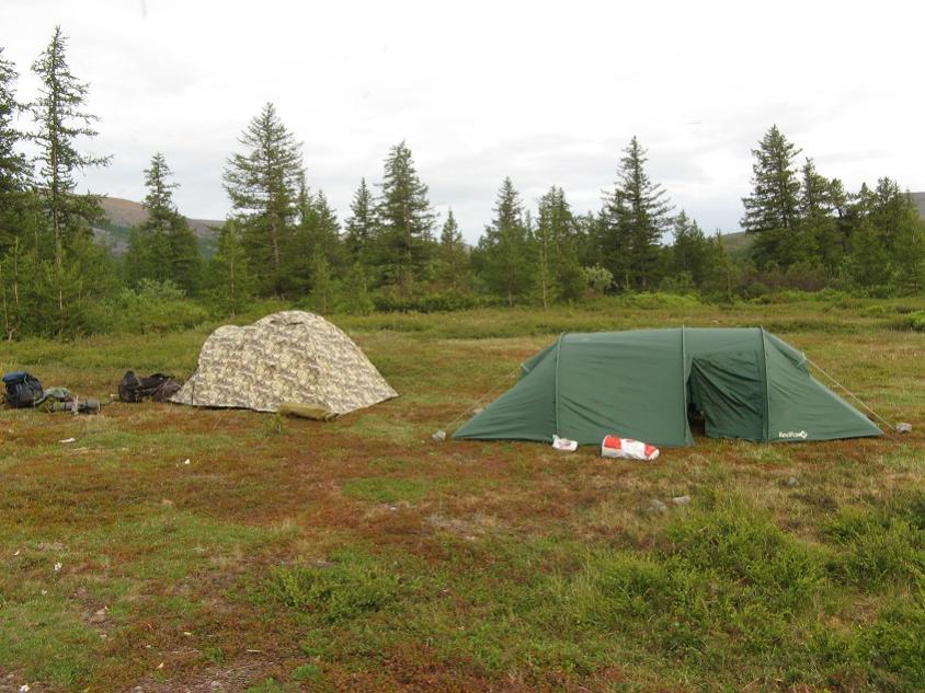 Решили ставиться. Еле удержали палатку вчетвером, чтоб не улетела. Ребята боялись что их палатку просто сложит. Всем было страшно. Я боялся что палатка рембы в которой мы ночевали с ним протечет под таким дождем и ветром. Укрепили камнями, чтоб не унесло. Так холодно мне не было никогда. Мы ночевали в походе и в -40 у костра, в тайге, но там было не холодно. Здесь был полный ахтунг. Дикая сырость, ветер. Ночью снег. И это конец июля месяца. У ребятв тамбуре поставили горелку, поели.