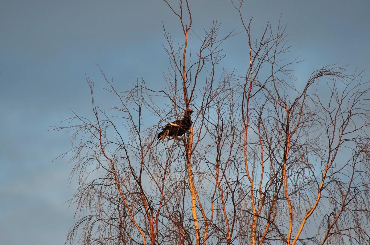 Где-то далеко забрехали собаки. Мы двинули в ту сторону и, спустя немного времени, вышли на уходящее в гору широкое поле, раскинувшееся на километры по склону. Очевидно, оно некогда было колхозным, но уже давно не засеивалось. Вдалеке белел развалившейся кладкой хлев, а за ним, в гуще крон, угадывались верхушки деревенских крыш. Невысокая пожухлая травка по всему полю не сулила хорошей охоты. И, глядя на разлившийся по вечернему небу золотистый закат, я уж думал повернуть назад к машине. Но за опушкой окаймляющего поле леса глаз заприметил какой-то просвет. Больше ради интереса, я потопал посмотреть, что это маячит за ним. Вскоре вышел на тихую лесную полянку. Кто-то из местных посеял в её дальнем конце пятачок овса и сколотил меж двух берёз нехитрый лабаз. Почти с края поля Цуна причуяла птицу и, протянув метров двадцать, застыла в стойке. С ружьём наготове, я подошёл вплотную к собаке. Выводок тетеревов, ладных, уже почти перелинявших в осеннее перо, шумно рванул в разные стороны из пестрого разнотравья. На этот раз время у меня было, и я удачно сбил дуплетом двух петушков. Собака исправно подала обоих...