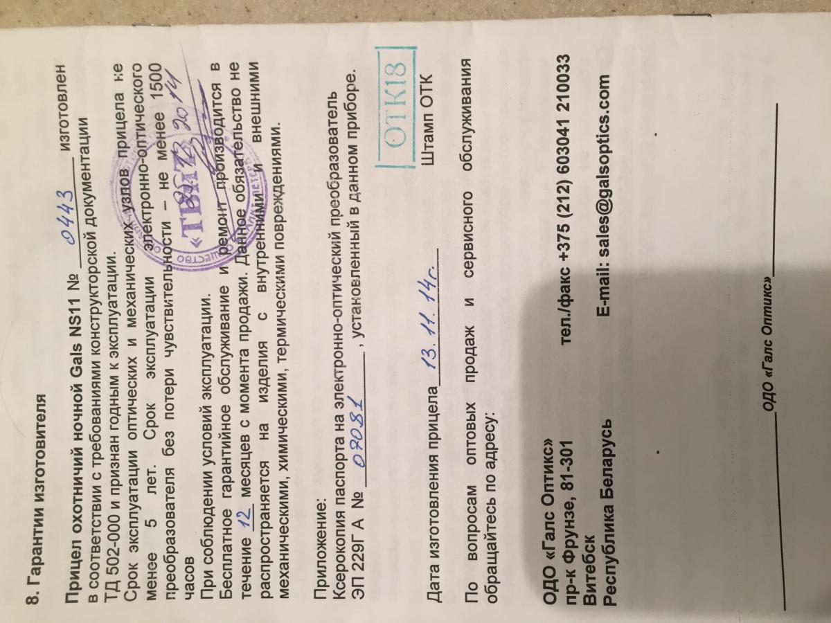 Продам ПНВ Gals NS-11 ЭП 229 ГА (металлокерамика ) Прицел куплен в 2014г в WHT. Отличное рабочие состояние.Назначение прицела«Gals NS-11» является охотничьим прицелом ночного видения 1+ поколения со встроенной ИНФРАКРАСНОЙ ЛАЗЕРНОЙ ПОДСВЕТКОЙ (ИКП). Прибор предназначен для ориентации на местности и стрельбы из охотничьего гладкоствольного и нарезного оружия в ночных условиях при температуре воздуха от -40 до +50 градусов Цельсия. Конструкция прицела обеспечивает стабильное положение прицельной марки при максимальных ударных нагрузках достигающих 5 000 - 7 500 Дж.. Применение встроенной ИК лазерной подсветки эффективно на расстоянии до 450м. Прибор имеет цельнометаллический высокопрочный влагозащищенный корпус, просветленную оптику с фокусируемым объективом и настраиваемым окуляром. Красная прицельная метка типа «Mil Dot» имеет плавно регулируемую яркость свечения.