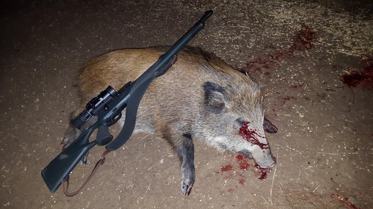 Смирившись, я решил этот вечер посвятить себе! Еще днём, пока все отлёживались, я проскочил по нескольким кормушкам. План действий был понятен, поэтому я быстро собрался, запрыгнул в УАЗа и в путь! Уже в пути, я переиграл свои планы и поехал на кормушку, к которой вплотную было не подъехать. Метров за 400 до кормушки дорога пересекает не большой ручей, протекающий в овражке глубиной полтора - два метра. В месте проезда была с давних времён сооржена переправа. Со временем она подобвалилась, но оставалась достаточной для проезда УАЗа. А по весне бобры у переправы соорудили плотину, вода поднялась и ещё сильней размыла переправу. Мы на скорую руку подлатали переправу, но смело по ней проезжаем только на квадриках. На УАЗах туда не суёмся. Я пожалел, что не поехал на квадрике, но время было упущено, поэтому только вперёд. Остановившись метров за 50 до переправы, собрал оружие, загнал патрон в патронник и пошёл к вышке. Тихо подошёл, на кормушке кроме соек никого. Забрался, устроился и стал ждать! Время 18.10. В течении двух часов пару раз выходил енот и всё. Поднялся не слабый ветер. Как бы нибыло холодно, всегда сижу с открытыми ушами, поскольку стоит их прикрыть шапкой, чувствую себя не только глухим, но и слепым! Вышка полуоткрыта, а ветер крепчал, поэтому сидеть становилось всё менее комфортно. В начале девятого впереди меня метров за 300 - 400 взвизгнули поросята! Я с облегчением вздохнул, что услышал их загодя и у меня достаточно времени подготовиться к их выходу, снять оружие с предохранителя, включить видеорекодер, удобно сесть, вложиться в оружие и т.д. Но, ...:ai: Не тут-то было!!! Я не успел снять предохранитель, как у меня за спиной послышался шум, который как морская волна с огромной скоростью нарастал и накатывал на меня! Вдруг, из-за спины посыпались кабаны и бегом мимо меня на кормушку!!! Они пробегали в 4 метрах подо мной, а я не мог пошевелиться, что бы их не спугнуть! Когда основная масса пробежала и я уже слышал в темноте возню в районе кормушки, за моей спиной в кустах осталась свинья (а может не одна)! Она не шевелилась и в течении пяти минут я не только слышал, как она глубоко и утробно дышит и внюхивается, но и просто ощущал её присутствие всем телом и сознанием! Потом она отошла и за спиной всё стихло. Только после этого я смог включить прицел и осмотреться. На кормушке кормились восемь крупных ранних поросят! И больше никого! Ни сзади, ни вокруг! У кабанов уже начался гон. И, похоже, мамка уже озаботилась будущим потомством. И поэтому отошла... А сеголетки так рванули на кормушку, потому что тоже услышали или почуяли приближение другого стада! Понаблюдав за ними более получаса, я отщипнул крайнего поросёнка и стал наблюдать за их отходом! Мне важно было понять, куда они отходят, далеко ли мамка, проявит ли она себя и т.д. В итоге, поросята гуськом обошли меня против часовой стрелки, ушли мне за спину, откуда и пришли, прошли к ручью и вдоль берега ручья ушли... Я проводил их, спустился и подошёл к своему трофею. Красивый, очень упитанный, крупный поросёнок!