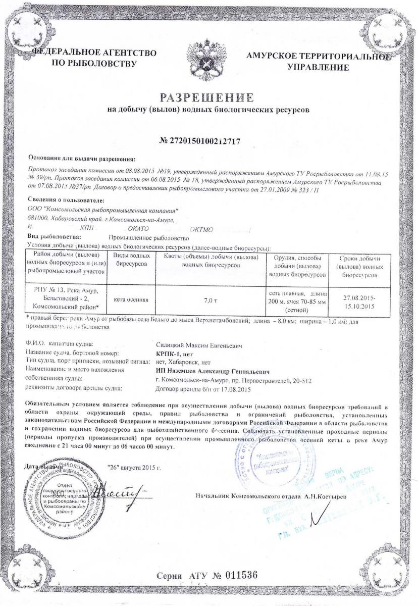Место вылова кеты: Комсомольск-на-Амуре (см. документы)