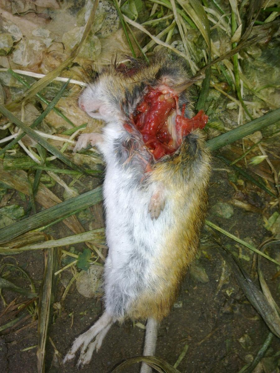 В прошлом году было много мышей в Псковсой области, да и не только там. На утро возле дома были найдены пару экземпляров вот таких останков. У одной мыши был выеден только мозг, другая на фото. Чья работа? Кошаки не наблюдались. Вечером была замечена сова. Собственно интересует кто - млекопитающее или птица так перекусывает? Изображение 010.jpg