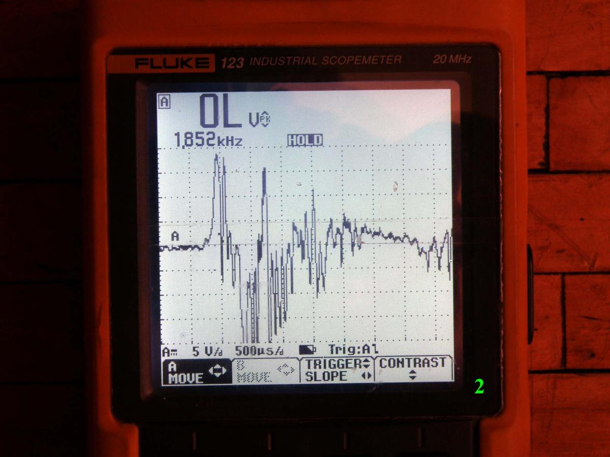 Патрон Техкрим-С. Шар 27.5 грамм. Затянул гайку. К сожалению зашкал по амплитуде. Да и по времени нужно бы растянуть. Мне кажется, что вся эта колбаса после первой клетки - это всякие волны, не имеющие отношения к выстрелу уже.