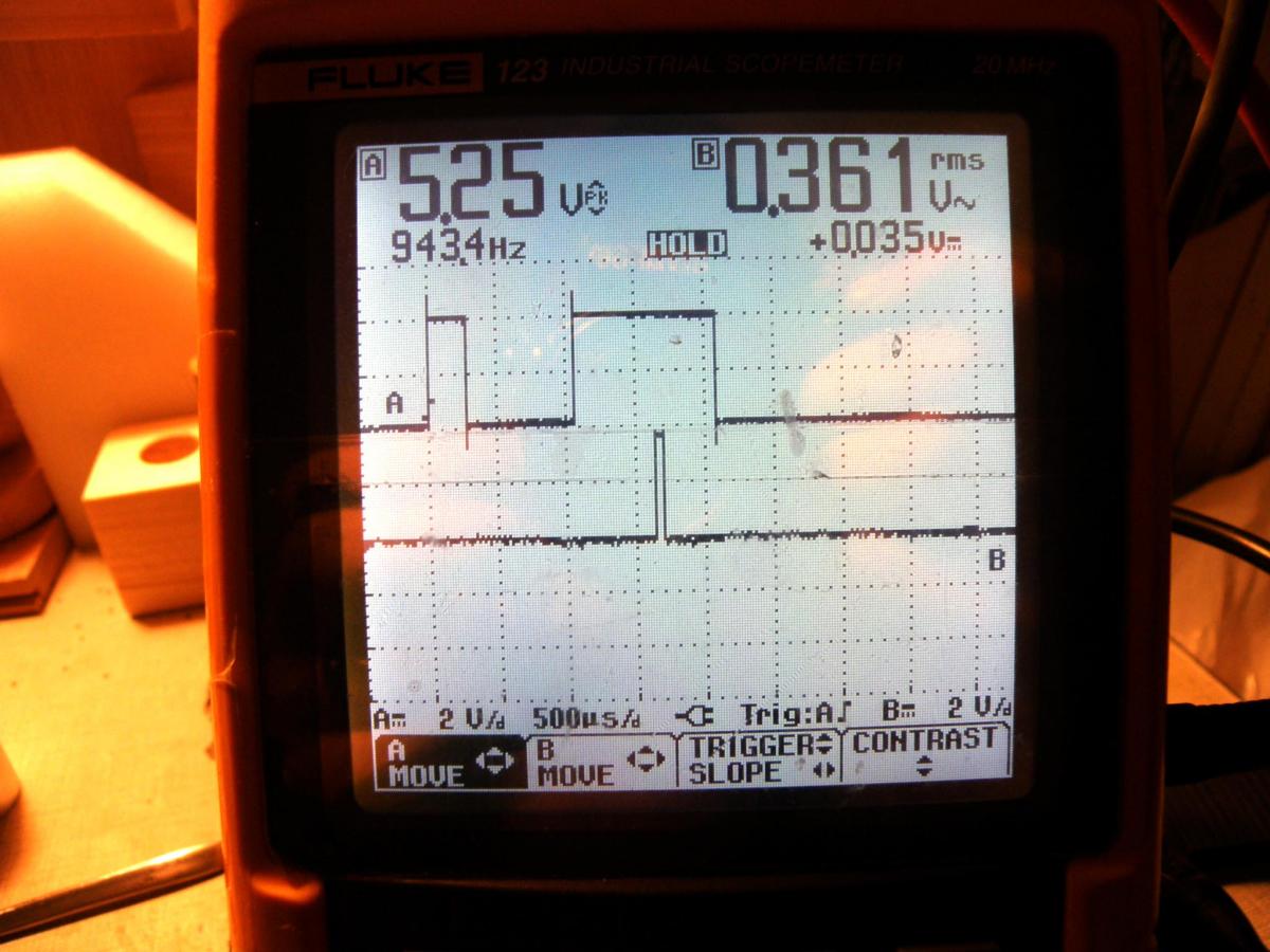 Присутствует несколько лишних навесных деталей для формирования второго фронта импульса т.к. контроллер ловит только по перепаду снизу вверх. Соответственно первый датчик ловится по фронту изначального импульса (желтый), а второй - по инвертированному импульсу (зеленый). Обычный инвертор подвешен.