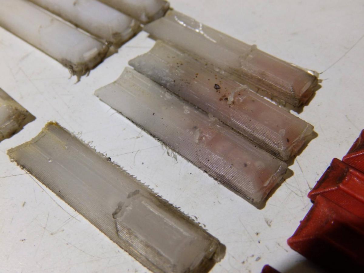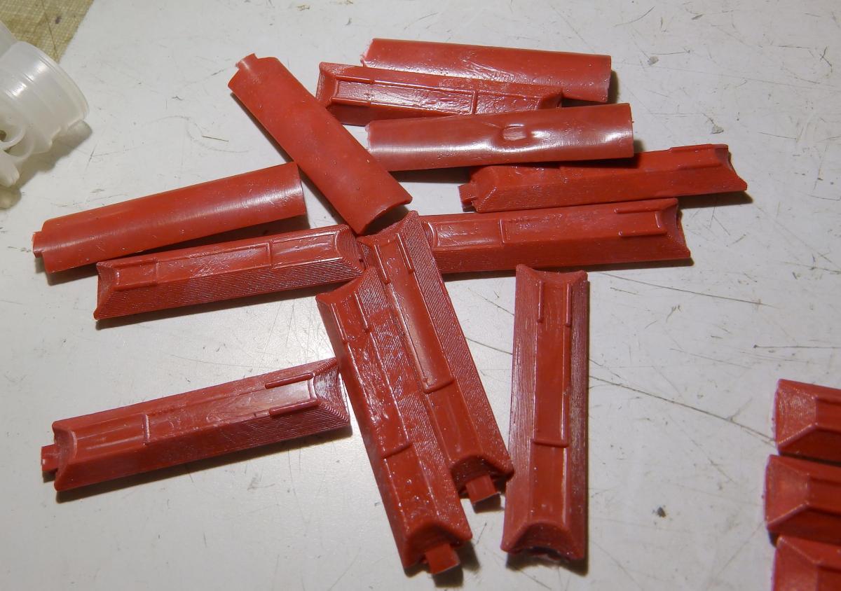 У меня есть мысль по поводу почему такие группы - отливки контейнеров были "получше" и "похуже". Когда форма оптимальной температуры - получается лучше, более прямой контейнер. А когда форма перегревается - получается похуже, по-кривее. Надо было бы отобрать те что по-лучше, а по-хуже - выкинуть... Но я поленился.