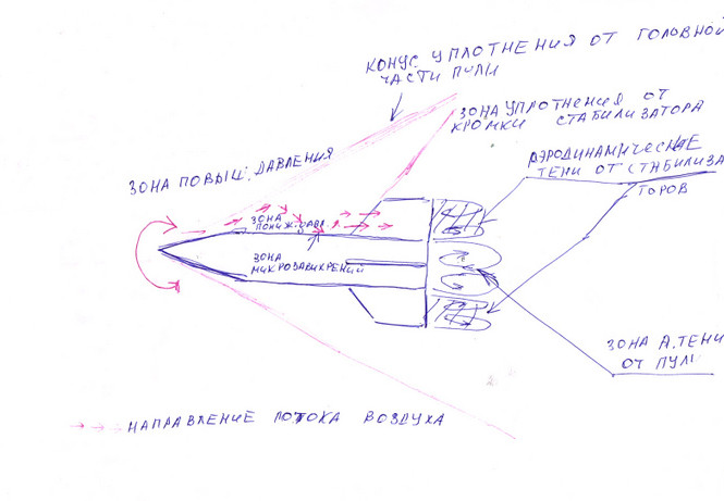 видишь ли, дядя Саша.... если перья стабилизатора при правильном положении пули в пространстве (то есть, головой перёд) будут находиться в аэротени, то это нормально. как только пуля начнёт лететь "неправильно", то есть повернётся относительно линии бросания, вот тут-то стабилизатор выйдет из этой аэротени и моментально попадёт под действие набегающего потока и вернёт пулю на путь истинный. именно так он и работает. стабилизатор работает не за счёт своего лобового сопротивления, а за счёт сопротивления плоскостей,вернее, разностей давления на противоположных поверхностях плоскости, возникающих только во время отклонения плоскости стабилизатора от оси движения пули. это тебе любой пионер авиамоделист подтвердит.