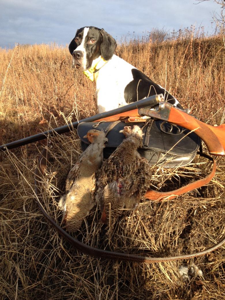 Идем вслед за стаей, находим – опять неудача, стая уходит, не подпуская нас на верный выстрел, но я все равно стреляю, в надежде разбить хотя бы выводок, и это мне удается: птица парами и поодиночке разлетается в разных направлениях вдоль и поперек оврага, по дну которого, вдобавок, еще и протекает ручей. Ориентируемся по ветру, выбираем нужное направление, помним про уроки Домманже, и вот, собака на стойке…. Аккуратно обхожу Рима сбоку, остается метров 15… Ближе подходить уже опасно, можно вспугнуть птицу…. Команда - «Пиль», Рим делает шаг, другой (тужит немного!)… Но пара птиц уже взлетает, я выбираю цель, жму спуск…выстрел… Куропатка падает замертво. Успеваю увидеть, куда улетает вторая, в это время Рим ищет и находит сбитую. Идем за второй, опять стойка, снова обхожу немного сбоку, посылаю собакена, Рим уже смелее идет вперед, птиц взлетает, я стреляю удачно, по моей команде Рим апортирует куропатку….все…пора домой, эту стаю более не трогаем, им надо еще зиму пережить, для нас же этот выезд – просто закрытие сезона охоты по перу с первопольным пойнтером…