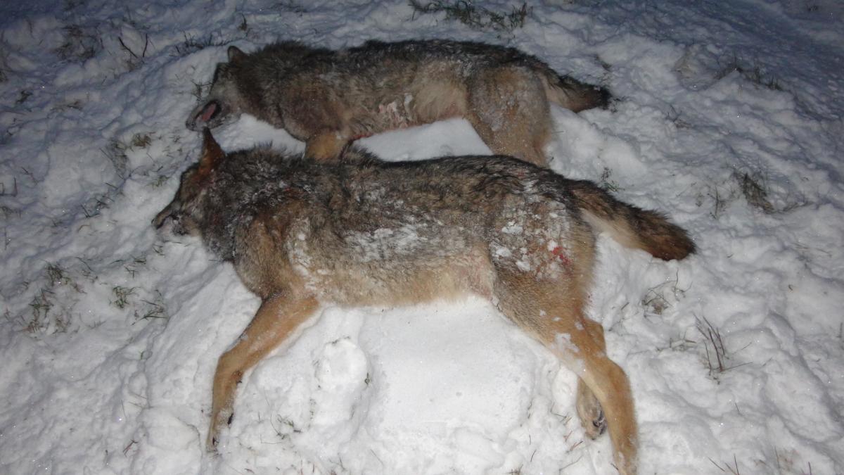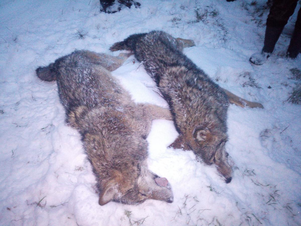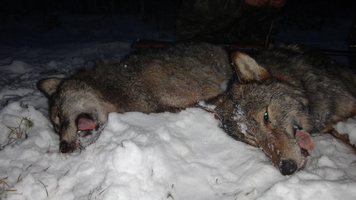 Первый день закончился, темнеет быстро. Итого твердыми взяли двух волков. По двум еще стреляли (в том числе я), но не добрали. Устроили небольшую фотосессию, пообщались, настроение хорошее, но вот чувство неудовлетворенности никуда не денешь. Решено что завтра будем добирать подранков, так как они остались в окладе.