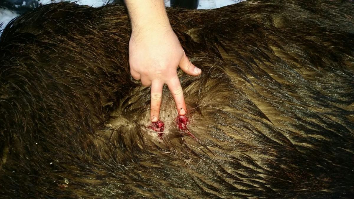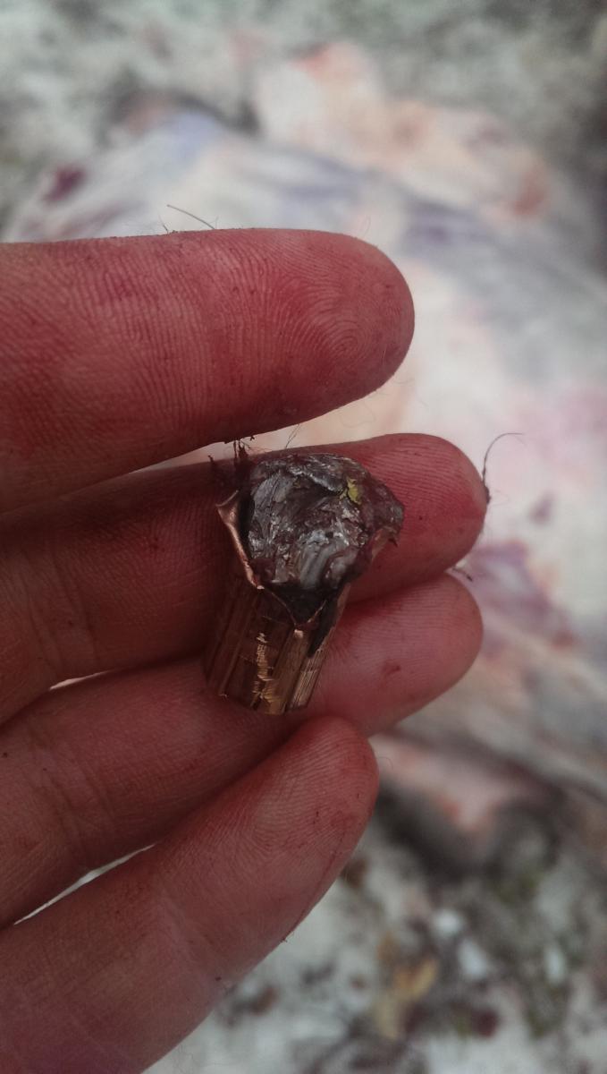 Потом когда разделывали, нашли сквозное в шее, пуля кстати попала в сосну, мы думали, что первый выстрел был не по цели, а он прошел на сквозь и пуля застряла в сосне. И еще нашли тоже в основании шеи сквозное, но пуля осталась с другой стороны под кожей не пробив её (это был четвертый выстрел, в угон)