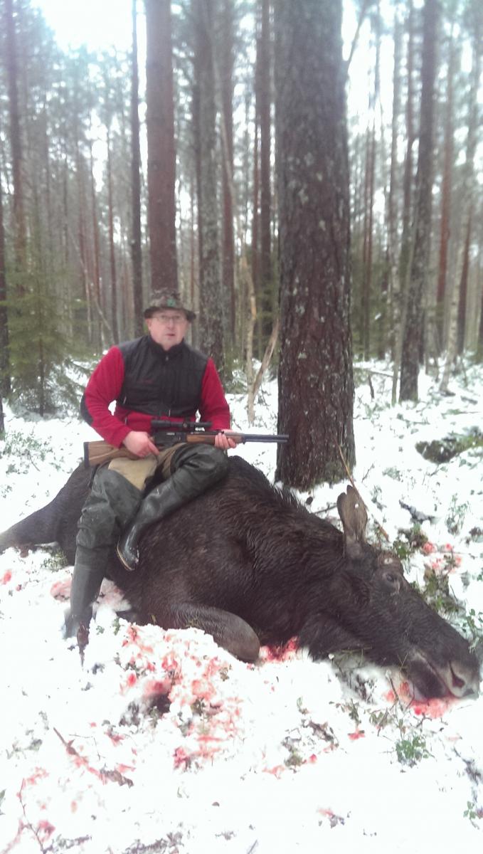 Я остаюсь на этой стороне канавы, охотовед кое как перебирается, я в случае если лось встанет готов стрелять. Охотовед подходит стороной ... готов лось, наглухо! Ура!