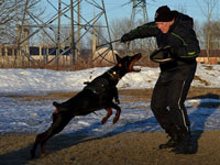 Этот курс дрессировки называется Защита. Мне инструктор после прохождения этогокурса говорил " а теперь забудьте, то чему вашу собаку здесь обучали.Потому что закон о самообороне у нас в стране не работает. Если не дай бог вашпес такое заделает с хулиганами или с бандитами, то вы понесете ответственностькак за применение оружия". Этот курс нужен для собак, которые в органах работают. Для простых собачников это, что ли для выстовок или для случек. Чем больше у собаки титулов и курсов дрессури это считается,что пес супер.
