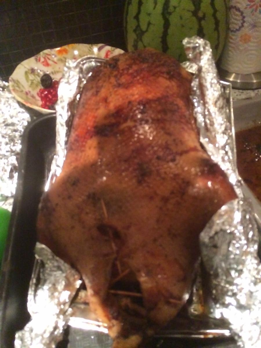 Сухого гуся солим, втирая в него эту соль и перчим , так же . Жирно намазываем всего гуся полученной в блендере пастой и даем ему пару тройку часов отдыха перед жаркой духовкой.