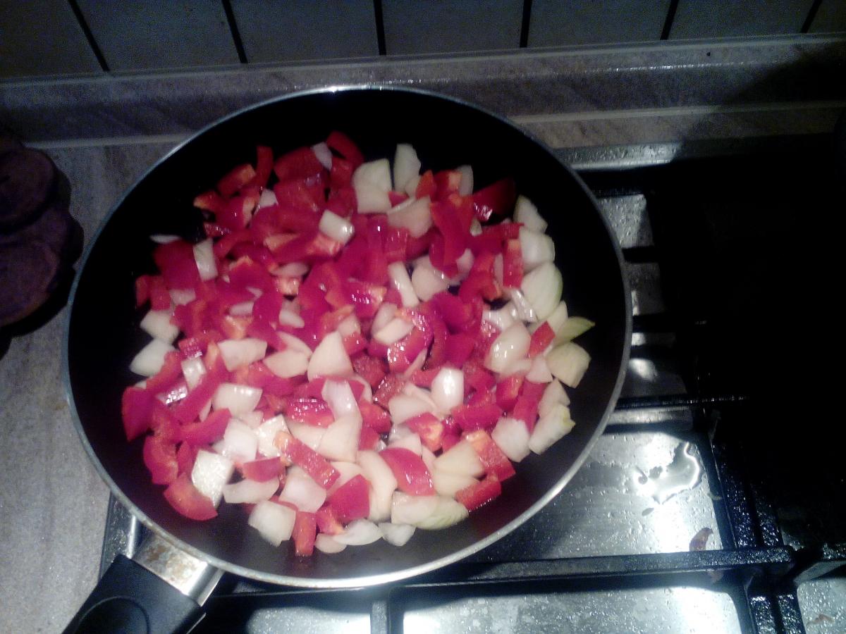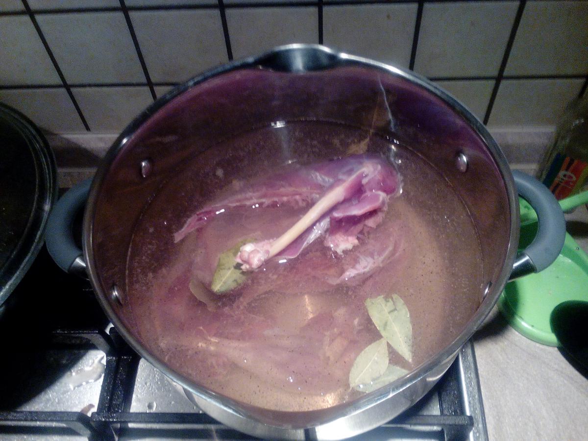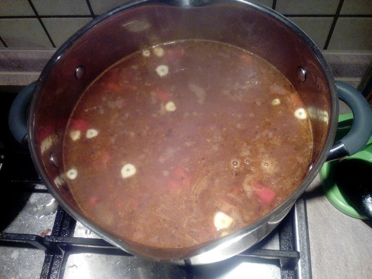 Доводим до кипения,пенку долой,уменьшает огонь,и оставляет на час томиться,в это время готовим пассировку,две средних луковицы и болгарский перец