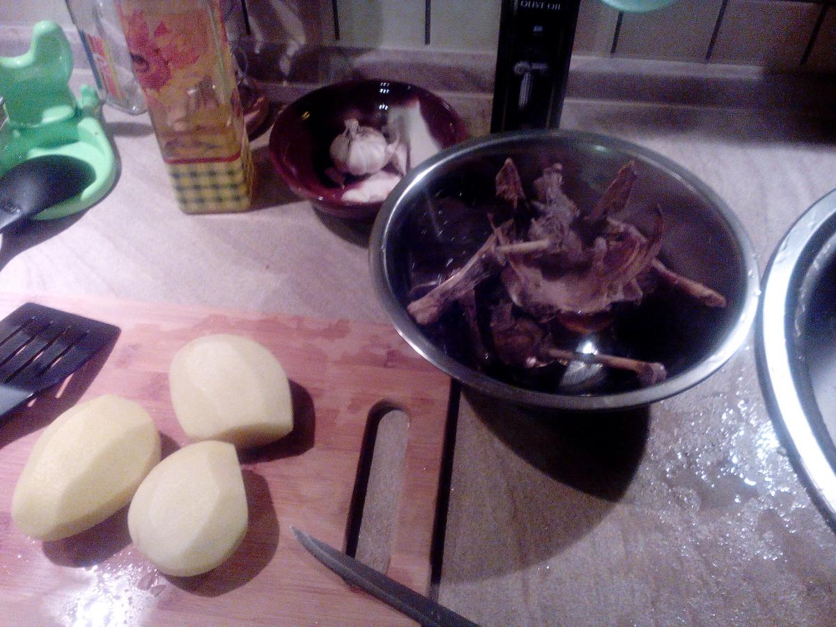 далее отправляем нарезаную картошку,фасоль и мясо обратно в кастрюлю,ещё примерно на пол часа(смотрим по готовности картошки)минут за пять до готовности закидываем мелконарезаный чеснок