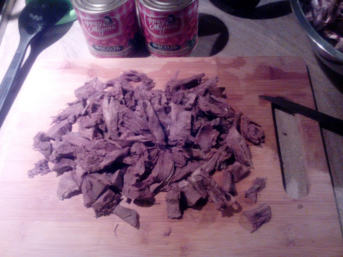 Пока пассировка обжаривается,чистим три средних картофелины,и открываем 2банки консервированном красной фасоли в томатном соусе,далее вынимаем кусочки гусика из кастрюли,даем остыть и отделяем мясо от костей