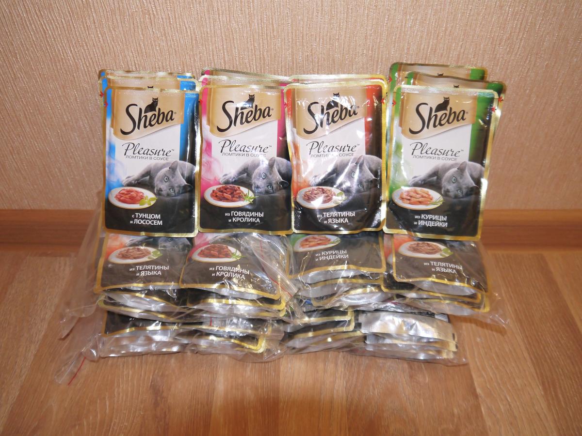 19.Влажный корм для кошек Sheba Pleasure, 85гр. для взрослых кошек. "тунец-лосось", "телятина-язык", "говядина-кролик", "курица-индейка". Продаю пакетами по 12 шт. в которых 4 вида по 3 шт. Срок годности у всех до сентября 2017г. цена пакета 12 шт. 240 руб. (20 руб./1 шт.)