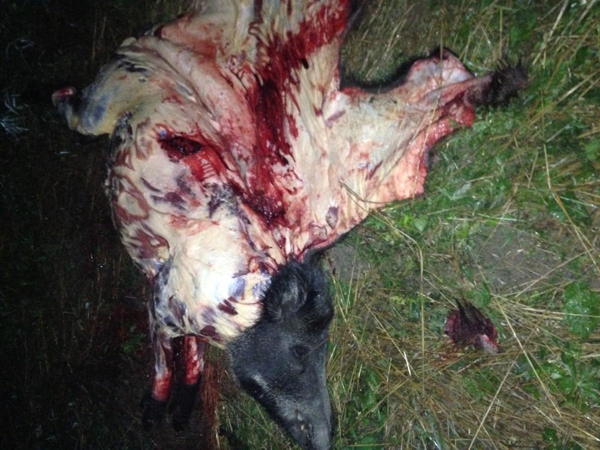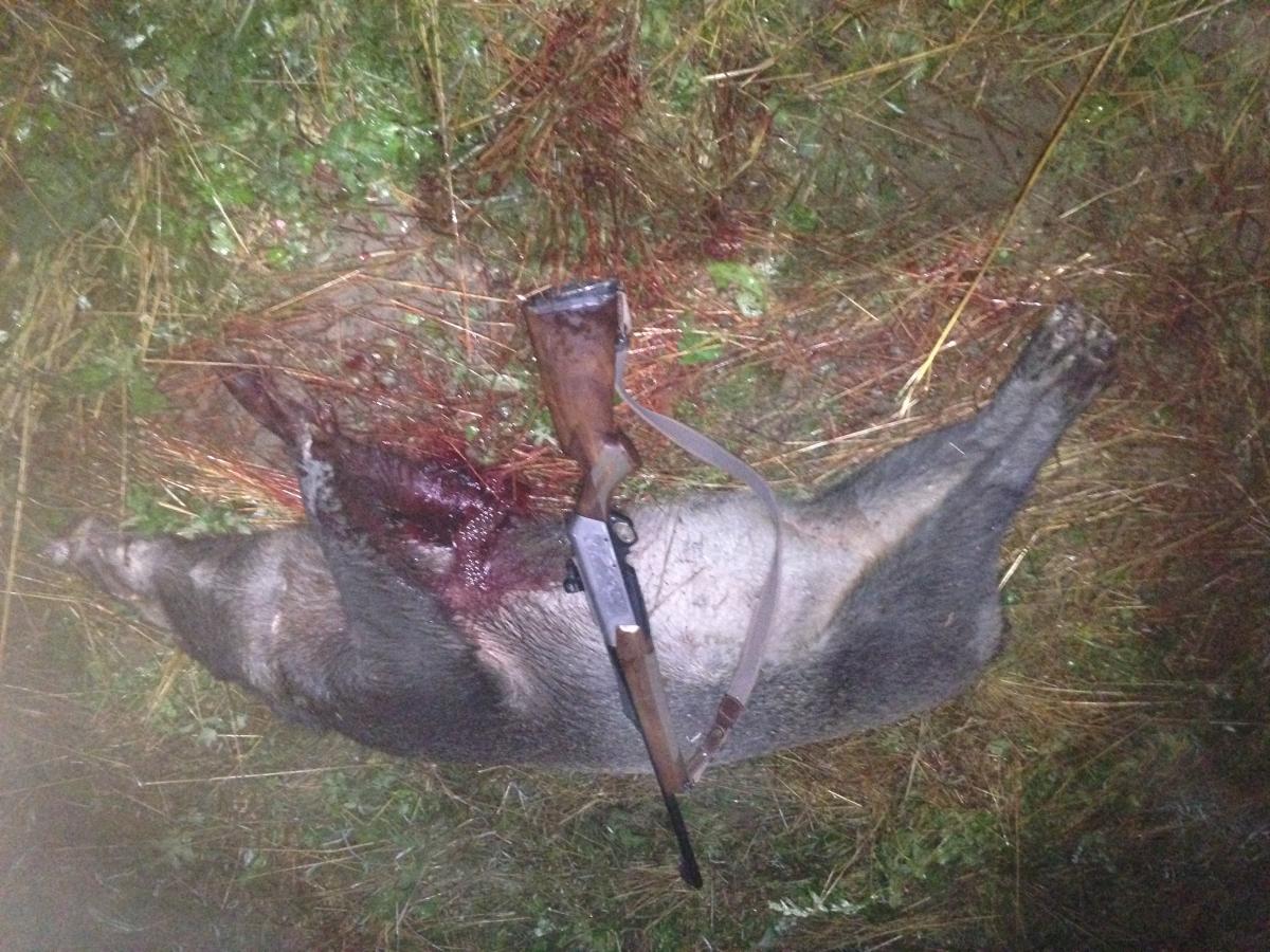 Первым был кабан, взял метров с 70-80 ночью. Удивило, что пуля изменила траекторию в теле животного. При том, что было разорвано сердце вышла практически из живота. Зверь стоял боком ко мне и лег на месте.(см. фото). Пулю нашел под шкурой. Отработала, на мои взгляд, просто отлично(фото прилагаю). Стрелял по нему второй раз, попал по позвоночнику, т.к. думал что двигается(ночью не особо понятно было). Там конечно же, вместо 2-х позвонков каша.