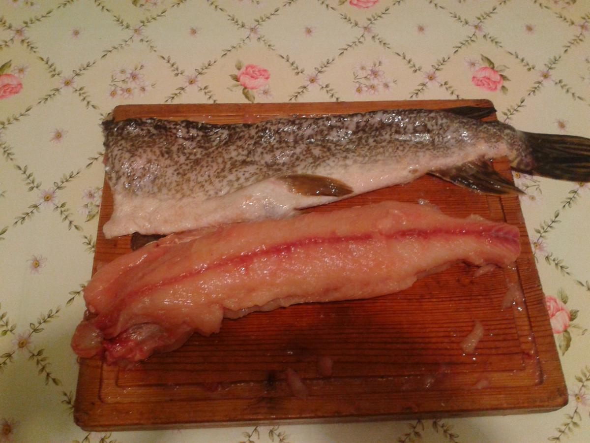 Теперь этим фаршем набиваем шкуру. Так же можно набить фаршем голову у которой сначала отделим жабры.