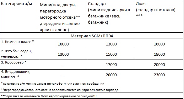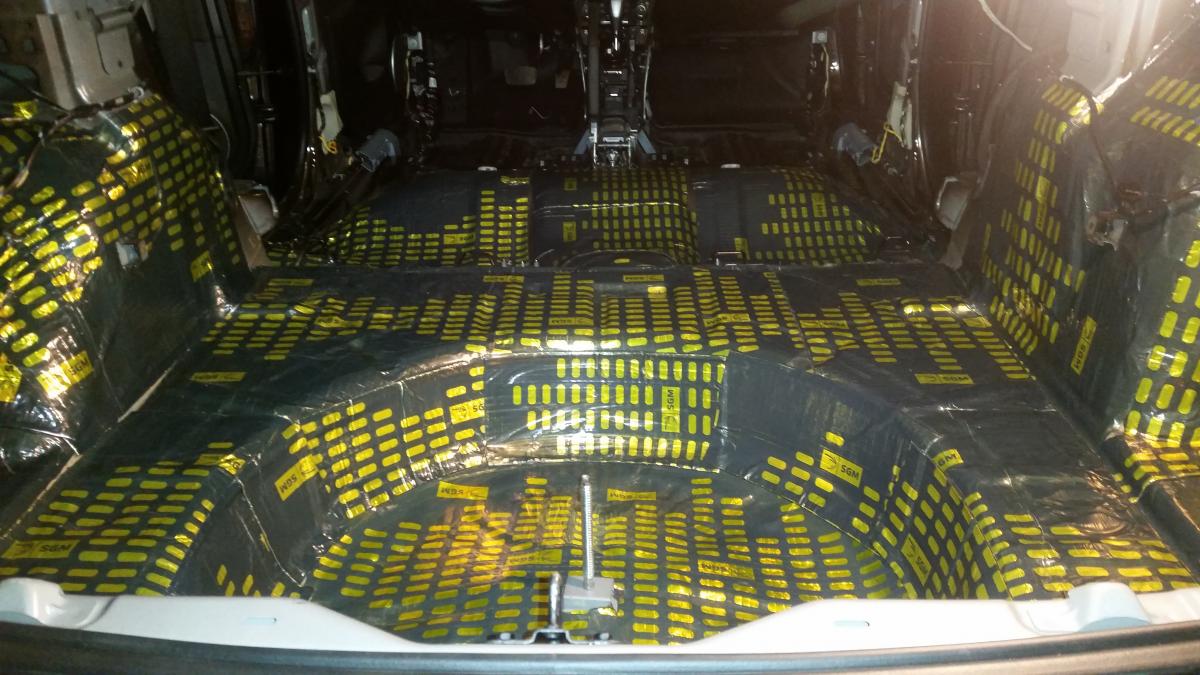 Шумоизоляция кладется в два слоя. Первым слоем укладывается виброгасящий материал Вибропласт толщиной 3 мм (гасит шумы связанные с вибрацией больших по площади частей кузова, таких как пол, двери, крыша, колесные арки и боковины багажного отделения.) Вторым слоем укладывается шумо/теплоизоляционный материал ППЭ или Сплен(пенополиуретан) толщиной 4 мм, который в свою очередь препятствует проникновению шумов в салон автомобиля и прекрасно удерживает тепло.