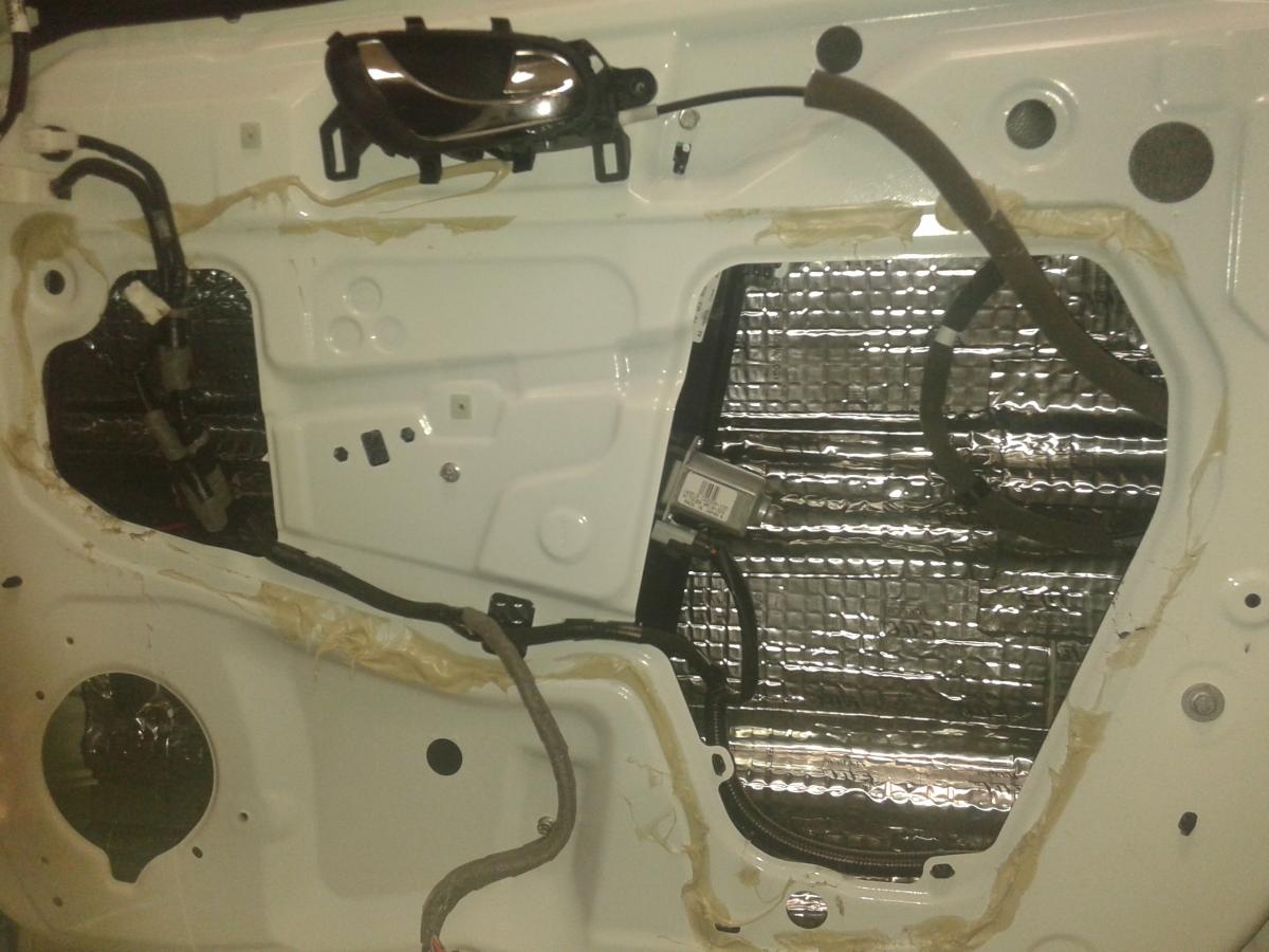 Также выполняем работы по акустической подготовке дверей. Что это такое? Это создание закрытого короба, для того чтобы звук стал более басистым и четким. Выполняются виброматериалом.