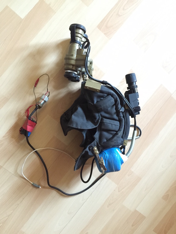Блок питания на ПНВ-57Е обмотан эластичным бинтом, чтобы свистел потише, сделана выносная кнопка включения и батарейный блок.