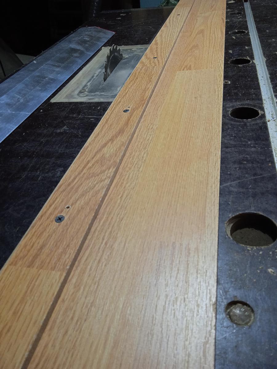 Берем паркетку и пилим ламинатину вдоль, упираясь левым краем опоры паркетки в привинченную полосу.