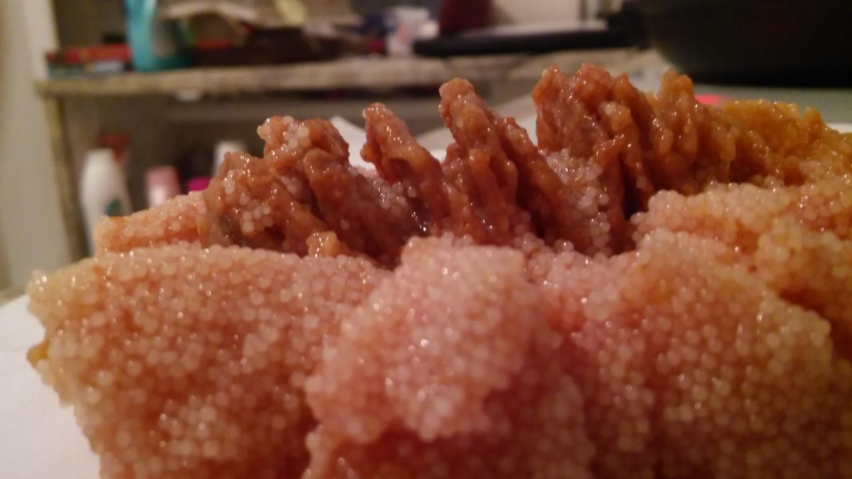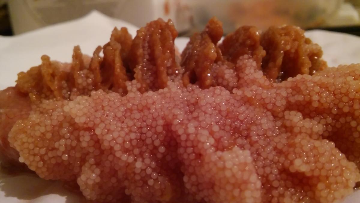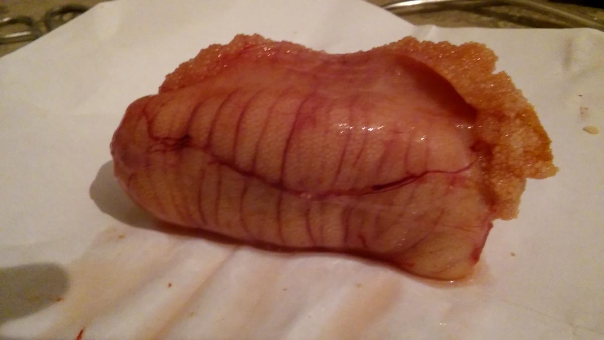 Нашел в окуневой икре какую то непонятную штуку. Представляет из себя ряд твердых пластин скрепленных между собой. Фотки прилагаются. Есть предположения что это может быть? Окунь ладожский, грамм на 350.