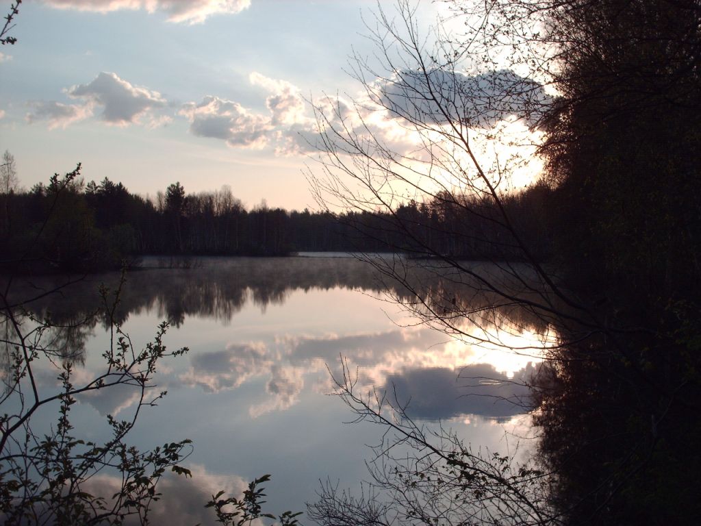 И вот оно - наступило долгожданное завтра. Выходим из машины и начинаем натягивать болотные сапоги. Нас буквально окутывает, противно пищащее облако комаров, кажется слетевшееся сюда со всего Ветлужского леса. Однако мы пропитаны запахом раптора, спиральку которого сожгли перед сном в салоне автомобиля. Почуяв страшный запах, кровососы так же как вчера от алкоголиков разлетаются от нас как от огня. Малиновое солнце показывается над темнеющим лесом, обещая нам погожий день. Полупрозрачный туман вьется клубами над гладью озера. Сосны на берегу смотрят на свои неподвижные отражения, словно дамы, проверяющие свои прически. Наскоро попив чаю, садимся в лодки и в нетерпении отплываем. Делаю первый заброс вдоль берега, слава богу – пусто. Это крайне суеверный в вопросах рыбалки ВИ приучил меня, что если на первом забросе следует поклёвка, значит всё – рыбалка не состоится- клева не будет. На одной из первых наших рыбалок эта примета подтвердилась. Тогда я, не успев отчалить лодку от берега, уже на первом забросе почувствовал хороший удар по блесне и после непродолжительной борьбы завёл в подсак хорошую щуку «за трёшку». На мою самодовольную улыбку ВИ ехидно отреагировал: