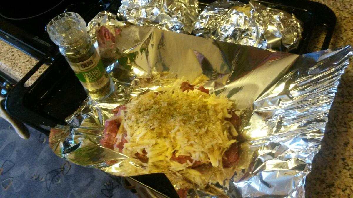 Шаг 2 - поверх мяса кладем слой сырого натертого на терке картофеля. Солим и добавляем приправы (травы).