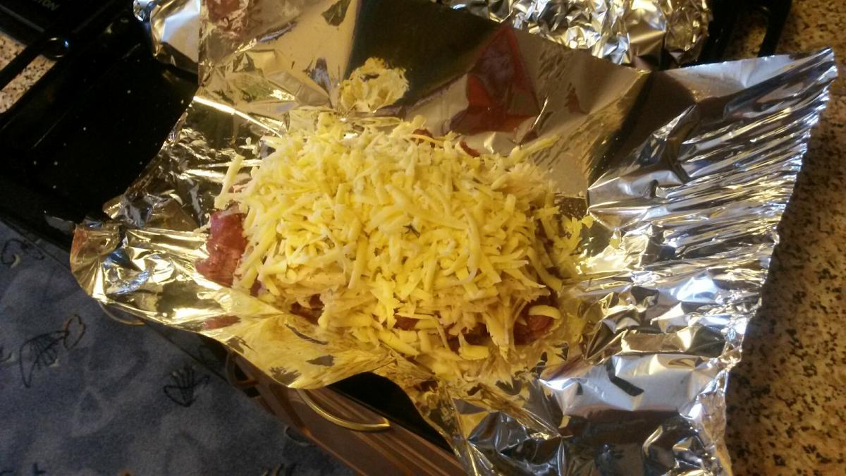 P.S. Сыр очень хорошо прилипает к фольге, так что лучше перед духовкой подвернуть фольгу оставив верх лаптя открытым.