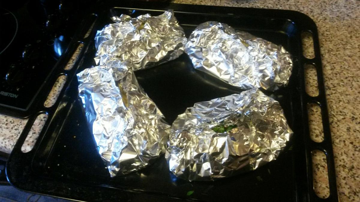 Шаг 4 - сворачиваем фольгу и отправляем протвень в духовку на 50-60 минут. Духовка должна быть уже разогрета до температуры 200-210 град. по Цельсию.