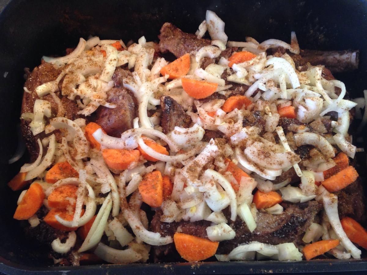 Укладываем мясо и овощи в гусятницу слоями, добавляем соль.