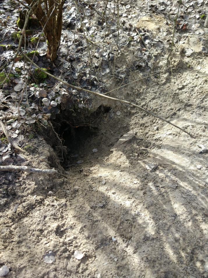 Как уже повелось у меня, иногда судьба подкидывает мне неожиданные встречи с волками. Ну или почти встречи. Так случилось и в этот раз. Получилось случайно напороться на волчье логово. Смешно? Конечно смешно! Случайно напороться на логово! Даже звучит смешно... 15 марта с. г., будучи на открытии весенней охоты, мы решили немного сменить место лагеря. Загрузили шышыгу и переехали на новое место. Развалки старого немецкого хутора, поросшие осинками, кустарниками, шиповником и терновником. Выбрали на краюшке пятачок в затишке от ветра и встали лагерем. И тут прижало по-крупному :cc: Взяв рулончик, я отправился в гущу зарослей. О! Смотрю холмик на фундаменте, разрушенного войной дома. Пробрался туда и взгромоздился аки горный орел на вершине горного утеса :ag: сижу наслаждаюсь гусиной песней со всех сторон. Глаза по-охотничьи бегают по окружающей местности. И тут взгляд упирается в большую дырку в земле. Подсознание сразу накладывает картинку с глаз на шаблон. Доделав дело, тихонько подхожу ко входу в нору. Ёоооо! Вся площадка укатана волчьими следами! :ai: На площадке так же было немного сена. Лаз большой. Воняет псиной. Не отходя от кассы, по телефону вызываю товарищей с ружьями. Изучаю следы вокруг. Кругом следы только одного волка, вернее волчицы. Молодой. Судя по следу - 70мм в длину стандартной 12 гильзы. От логова отходят 4 тропинки. 1 самая набитая ведет напрямую 30 метров к ручью-канаве с проточной водой. Остальные три выходы с хутора в разных направлениях. При выходах на поле на открытое чуть в сторонах от тропинок какашки, явно не лисьи. С шерстью и белыми костями. Крайняя колейка вокруг хутора так же утоптана волчьими следами. Не отходя от логова организовали раскопки. Накрыли вход сеткой, пробили несколько шурфов. Одним попали в нору. Метрах в 1,5-2 от входа. Поскольку логово было обустроено в разрушенном фундаменте подвала немецкого дома, копать было адски. Бетон, кирпичи. И тут еще как на зло, ход был под корни дерева. Ночь перед открытием, пол дня охоты были позади. Сил осталось ноль. Их просто не было. Ни капельки. Обзвонили всех известных волчатников, местных и всяких главных охотоведов. НИКОМУ НИЧЕГО НЕ НАДО! :cg: Приезжайте говорим, докапывайте. Нет не надо... И тут в голову полезли философские мысли... Мать жалко, детей жалко... Да ну нах, нечего жалеть! Надо сделать то, что надо сделать человеку с волчьим гнездом. Обессилившие, мы наглухо позабивали шурфы и вход бытым бетоном, кирпичами. НАГЛУХО! Внутри была волчица или нет не знаю, правильно ли поступил в этой ситуации, судите сами...